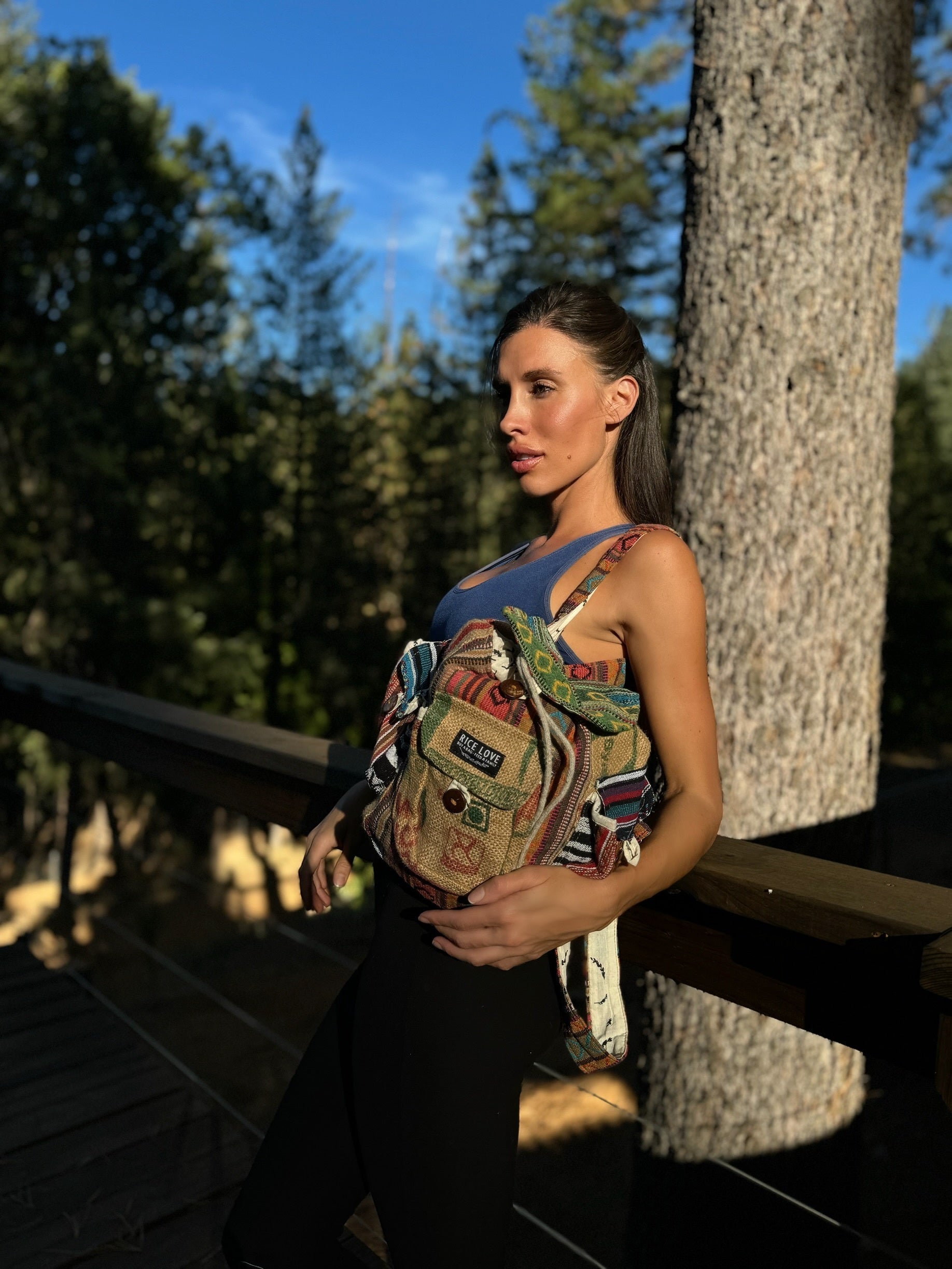 A bold, one-of-a-kind mini backpack that turns heads. Handmade from recycled rice bags and bursting with personality.
