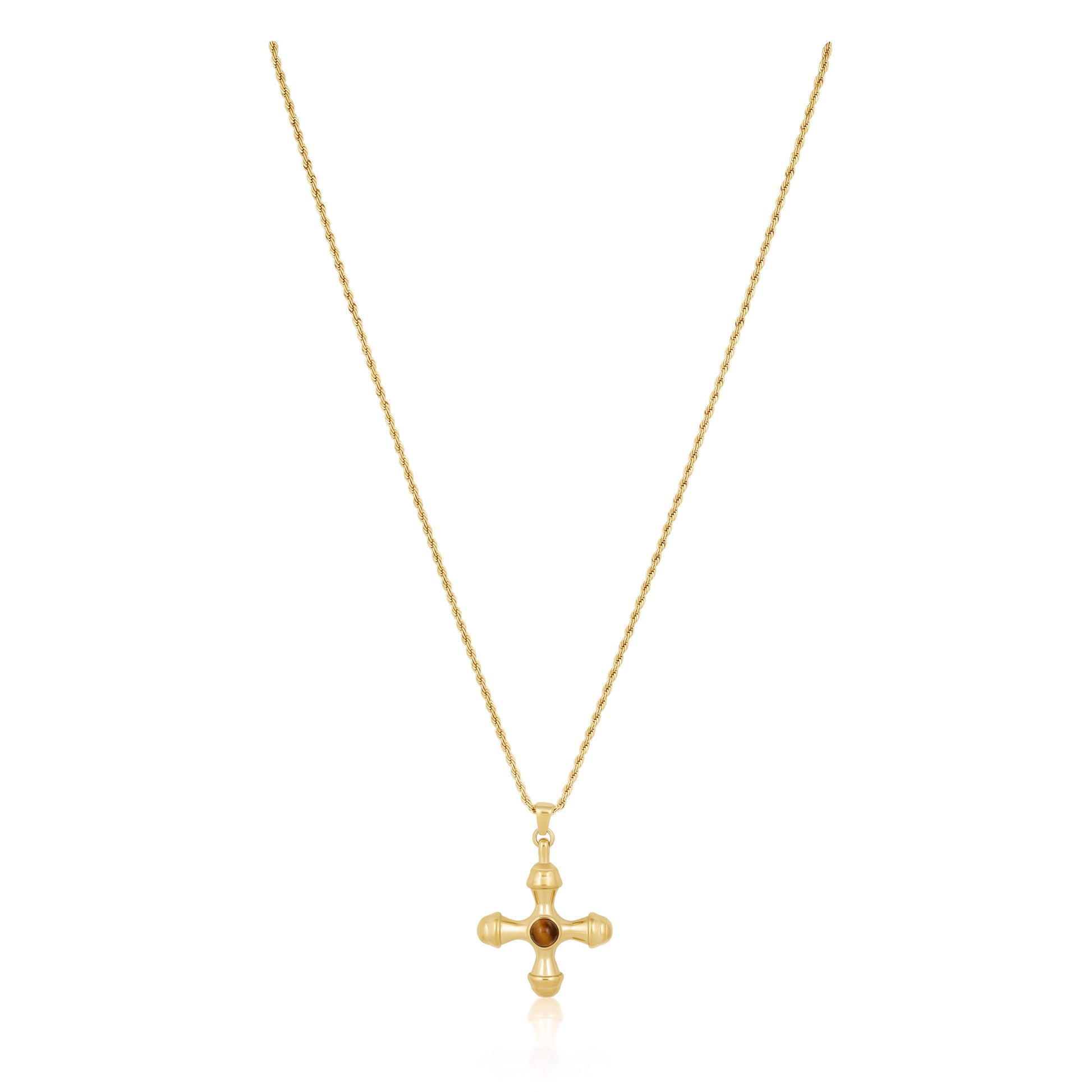 Unleash your inner strength with the Ophelia Cross Necklace. This stunning necklace features a Tiger Eye Stone cross, symbolizing courage and protection. Elevate your style and feel empowered with this unique and meaningful accessory.