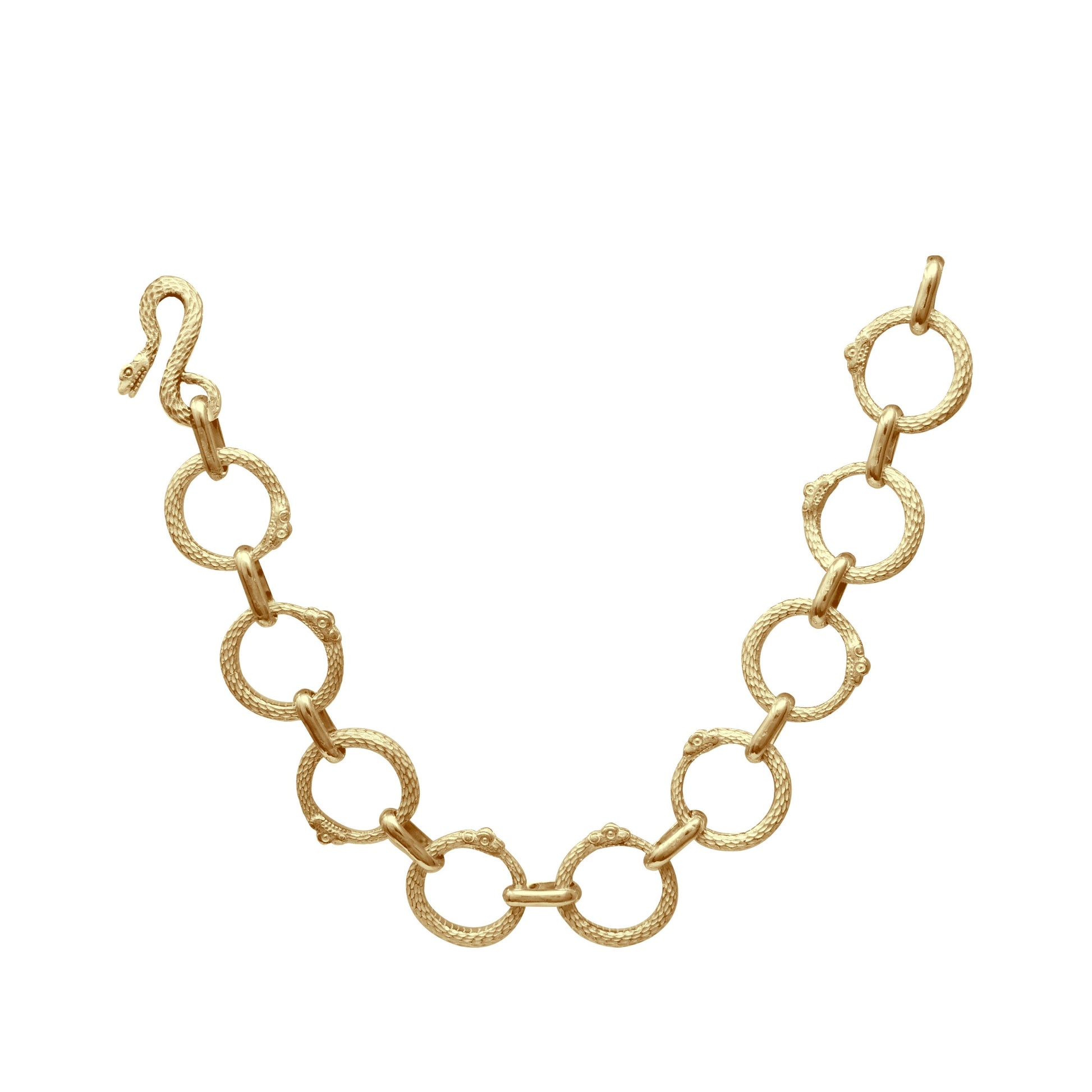 Introducing our Ouroboros Chain bracelet: A luxurious homage to ancient mysticism and eternal cycles featuring sculptural circular serpent links.
