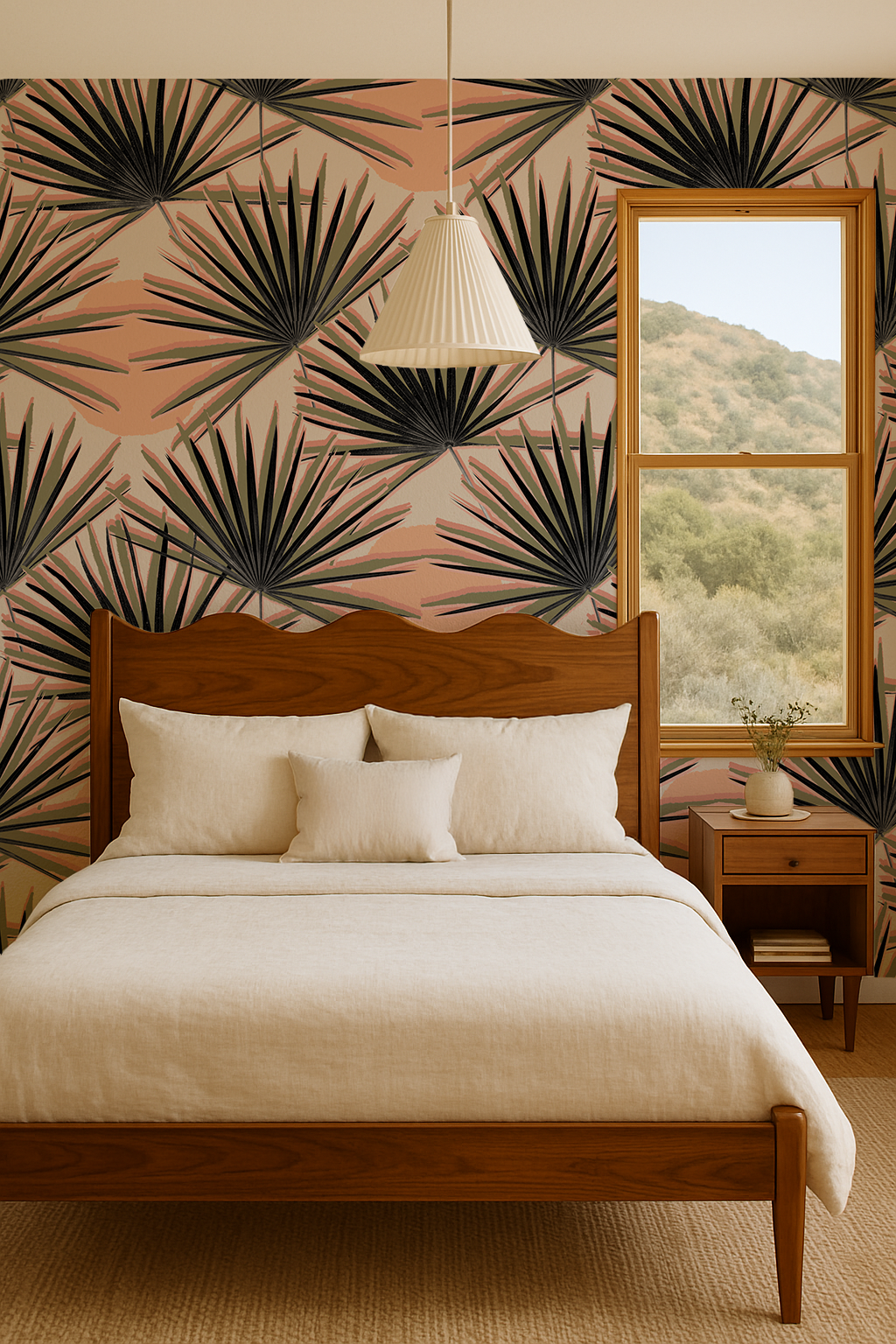 Bring a splash of golden girl charm and Palm Springs flair to your space with our Palm Deco Wallpaper in hip coral & olive. Illustrated by Samantha Santana, this stylish design adds a playful yet sophisticated touch to any room. Choose between easy peel-and-stick vinyl for quick application or smooth traditional paste for a classic finish. Plus, it’s completely removable, making it perfect for renters or anyone who loves to refresh their decor with ease.