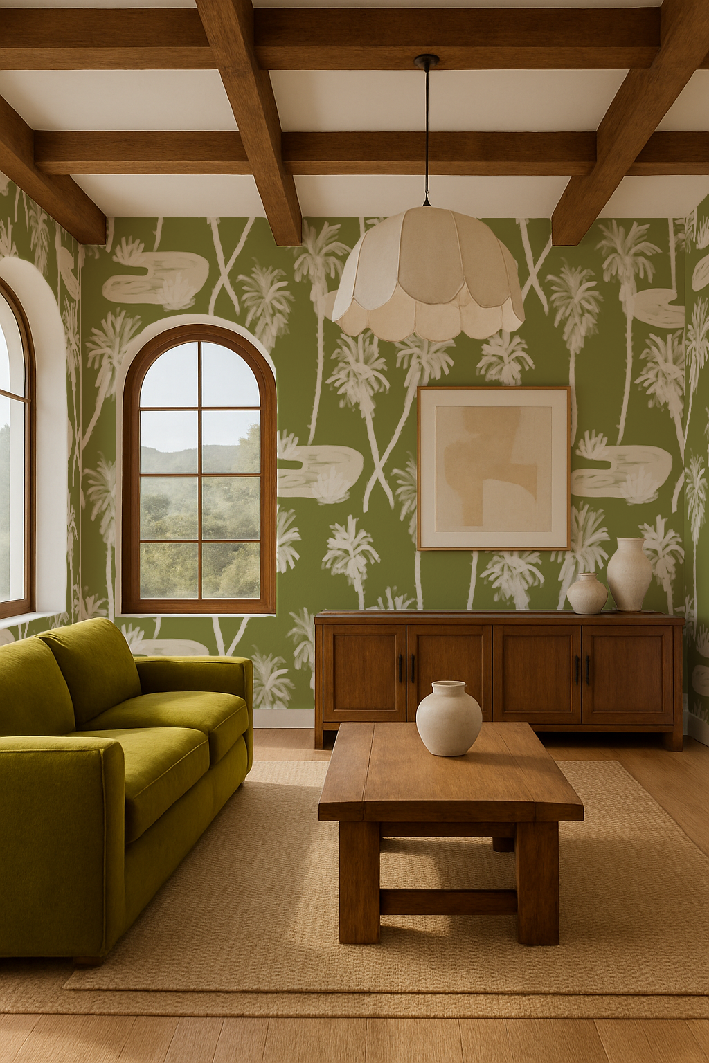 Palm Oasis Wallpaper, olive green and white