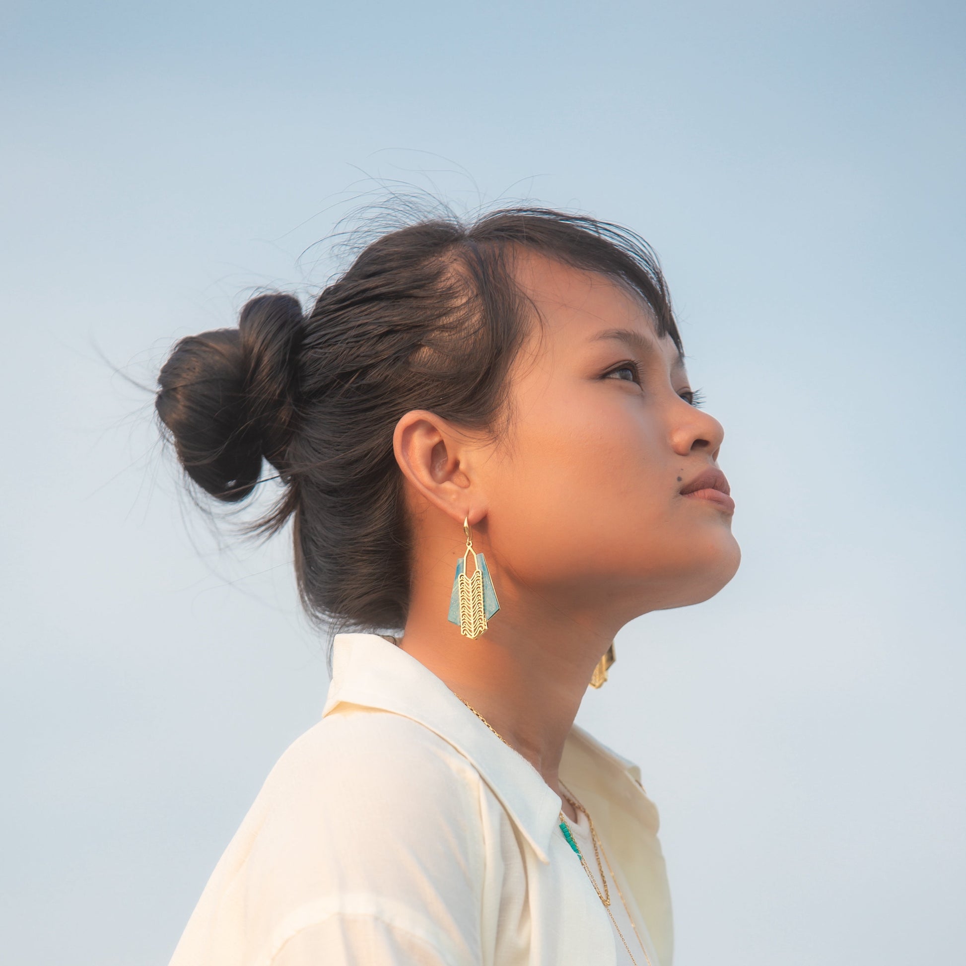 The Parting Waters Hook Earrings feature a 1.9" by 1.2" 18K gold-plated stainless steel pendant adorned with blue polymer clay on 18K gold-plated 316L medical-grade stainless steel hooks.