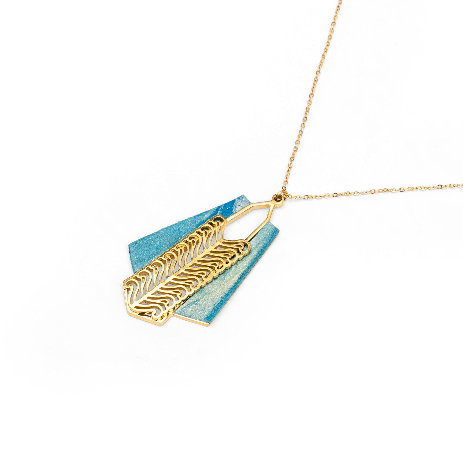 A layered necklace set featuring two complementary pieces: a 30” necklace with a 1.9” x 1.2” pendant accented with ocean-toned polymer clay, and a 17” rectangular-link chain adorned with genuine turquoise beads. Both include 1.3” extension chains and are crafted from 18K gold-plated stainless steel.