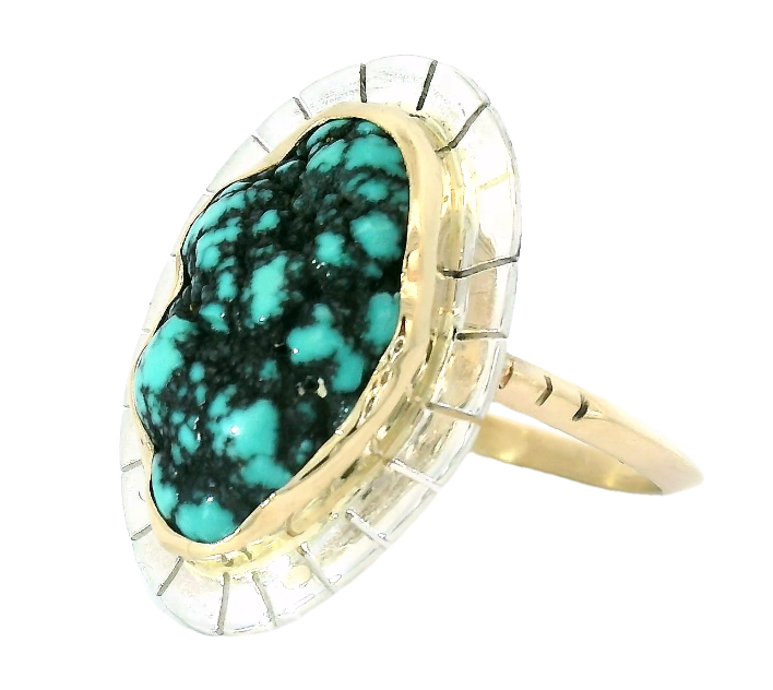 This ring is ready to ship in a size 6.75. If features A unique textured and organic shaped nugget of Morenci turquoise set in a warm yellow gold bezel. Featured serrated silver halo and our carved golden, triangle Helena band.