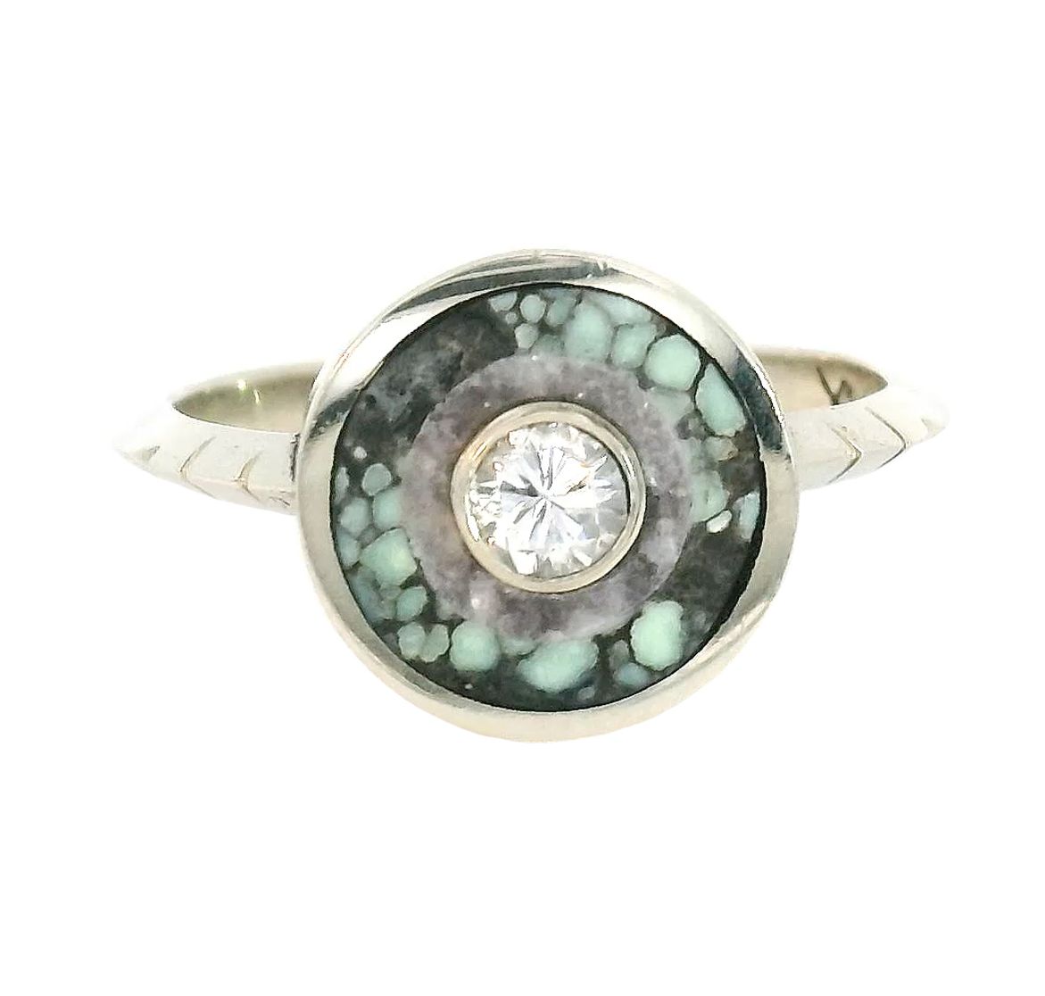 This size 6.5 ring features concentric circles of hand inlaid Colina Verde Variscite & Lepidolite highlighted with a sparkly white diamond. This one of a kind ring is a modern and fun statement on color and design! A truly creative, collectable piece of Young In The Mountains inlay work.