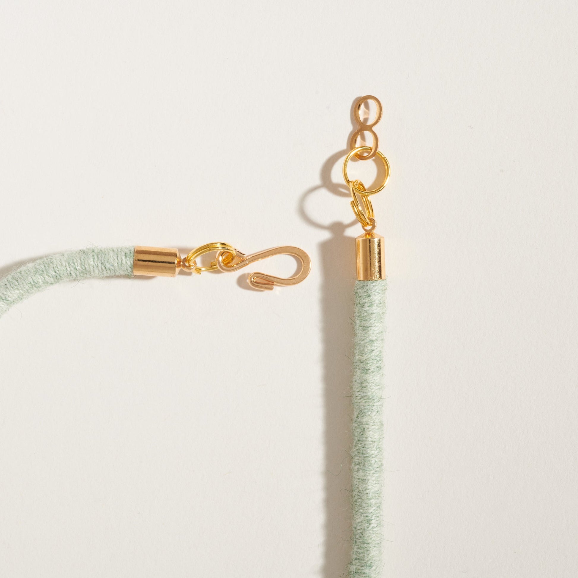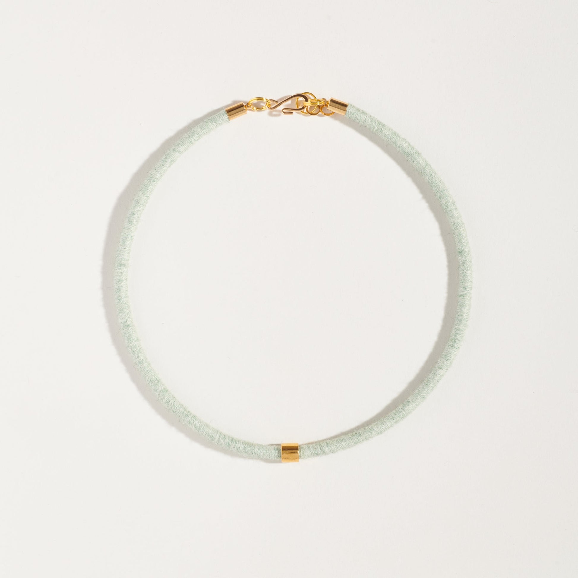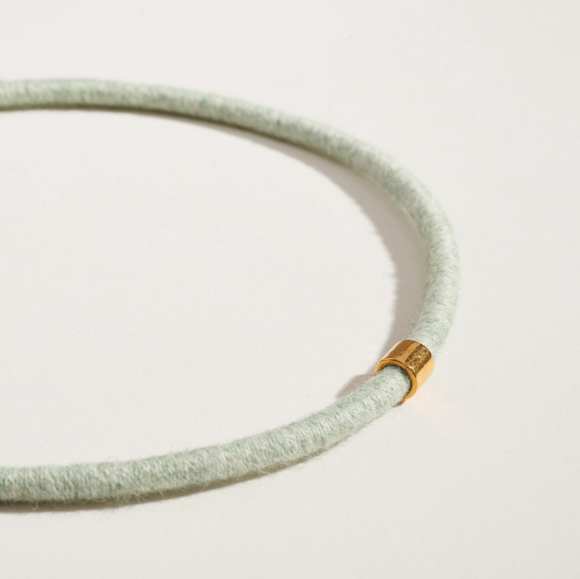 Using our thinnest cording, the Petit Necklace transforms into a sophisticated everyday collar-length piece. Shown and modeled in Mint Wool (color not currently available).