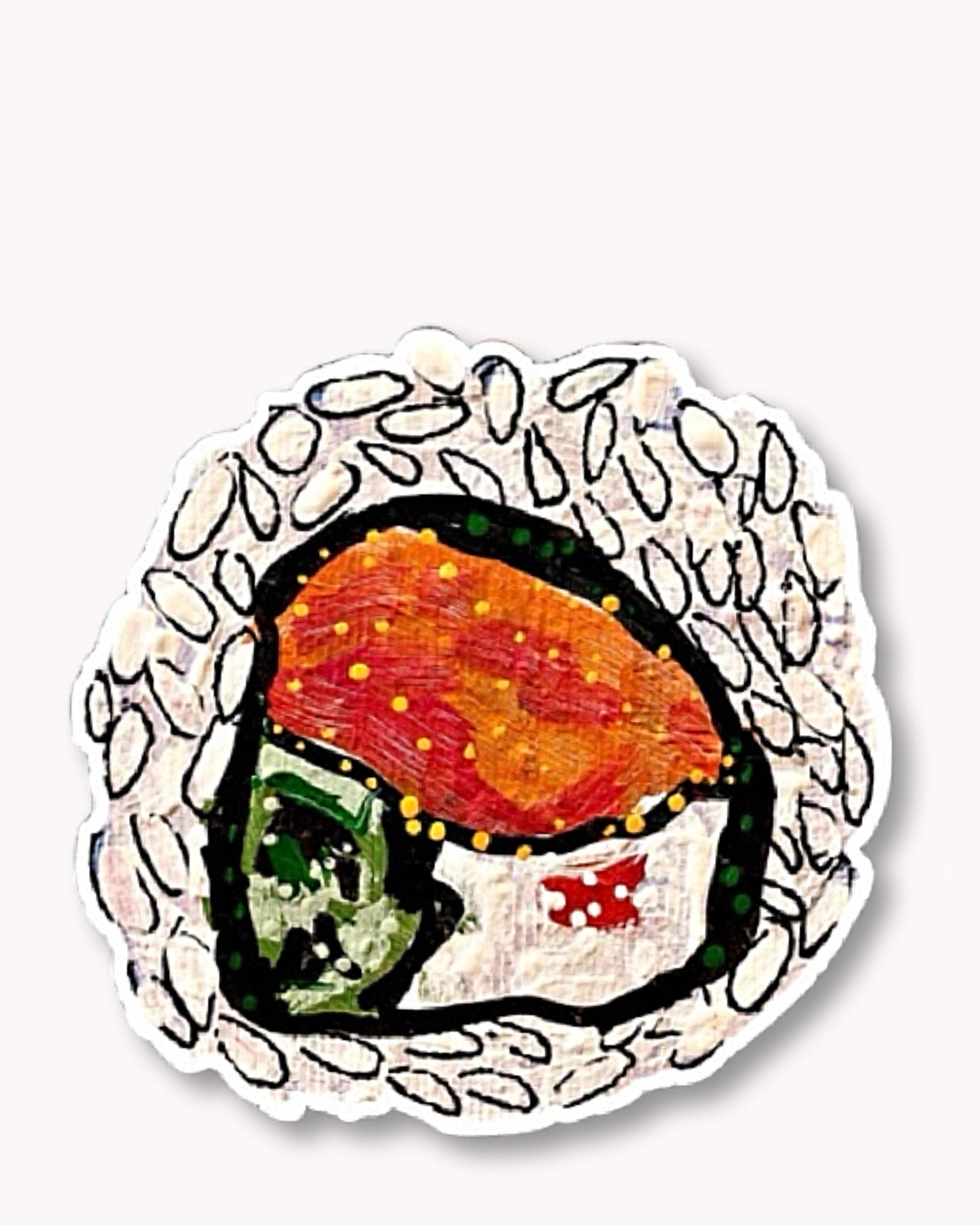 All vinyl stickers have a solid color boarder and are made by the artist in studio.