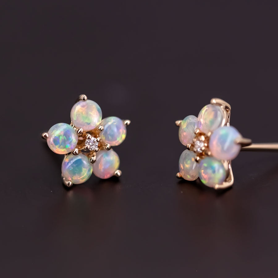 Plum Blossom Sakura Solid Opal Diamond Stud Earrings 14k Yellow Gold