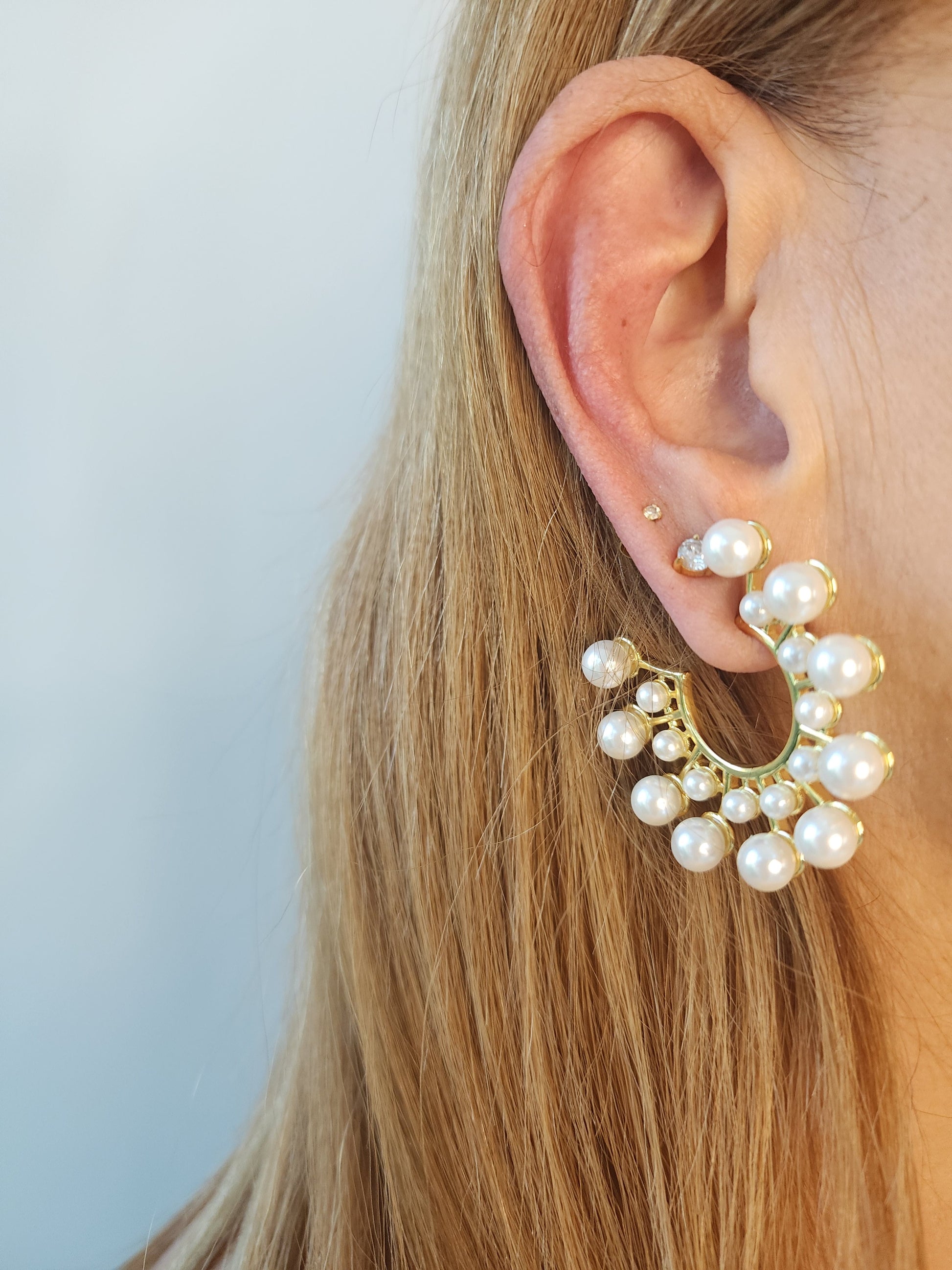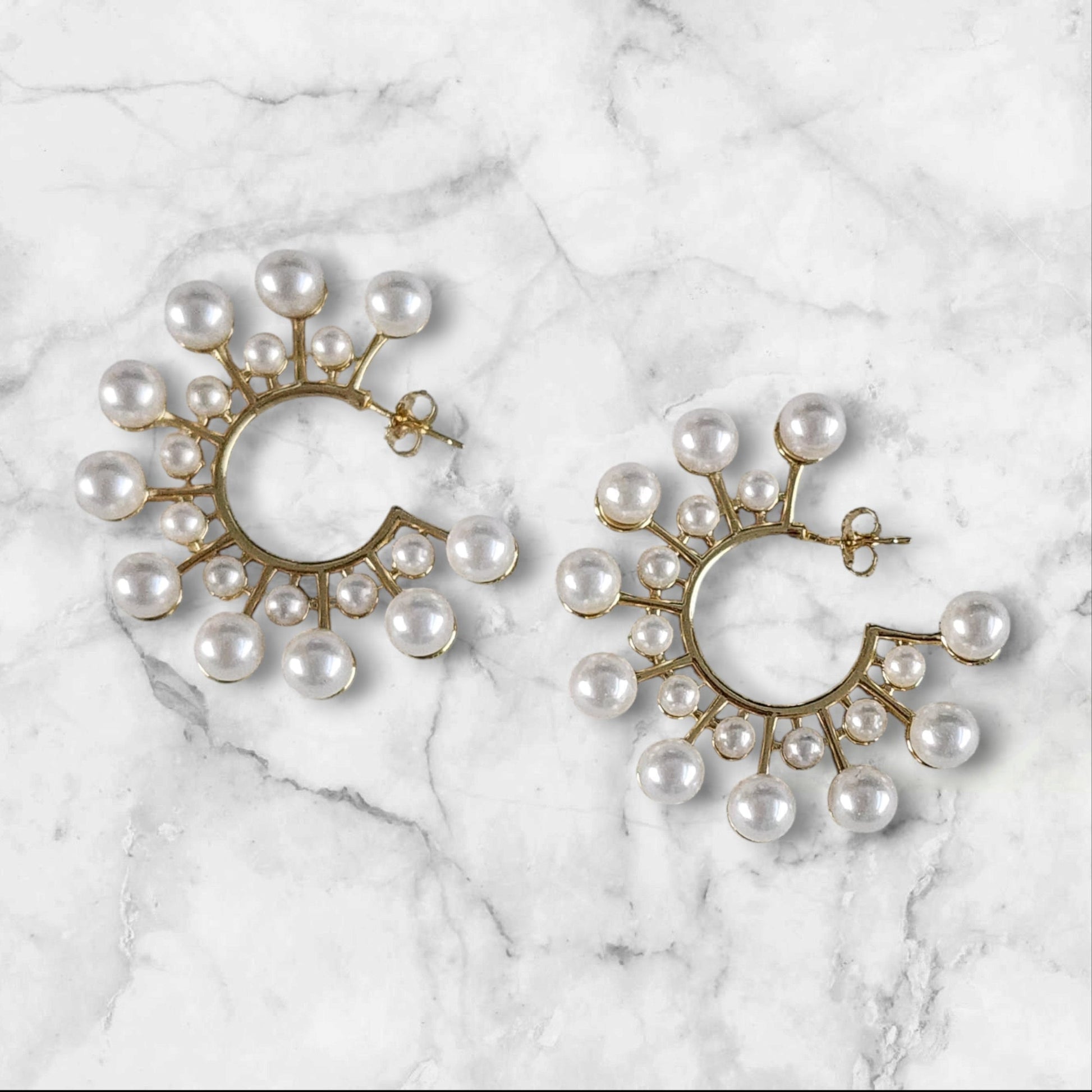 PRIYA earrings are a bold statement piece crafted from hypoallergenic 925 silver and 18k gold. The oversized hoop design is accented with lustrous pearls, adding a touch of elegance to any outfit. These earrings are perfect for those with sensitive ears, ensuring both style and comfort.