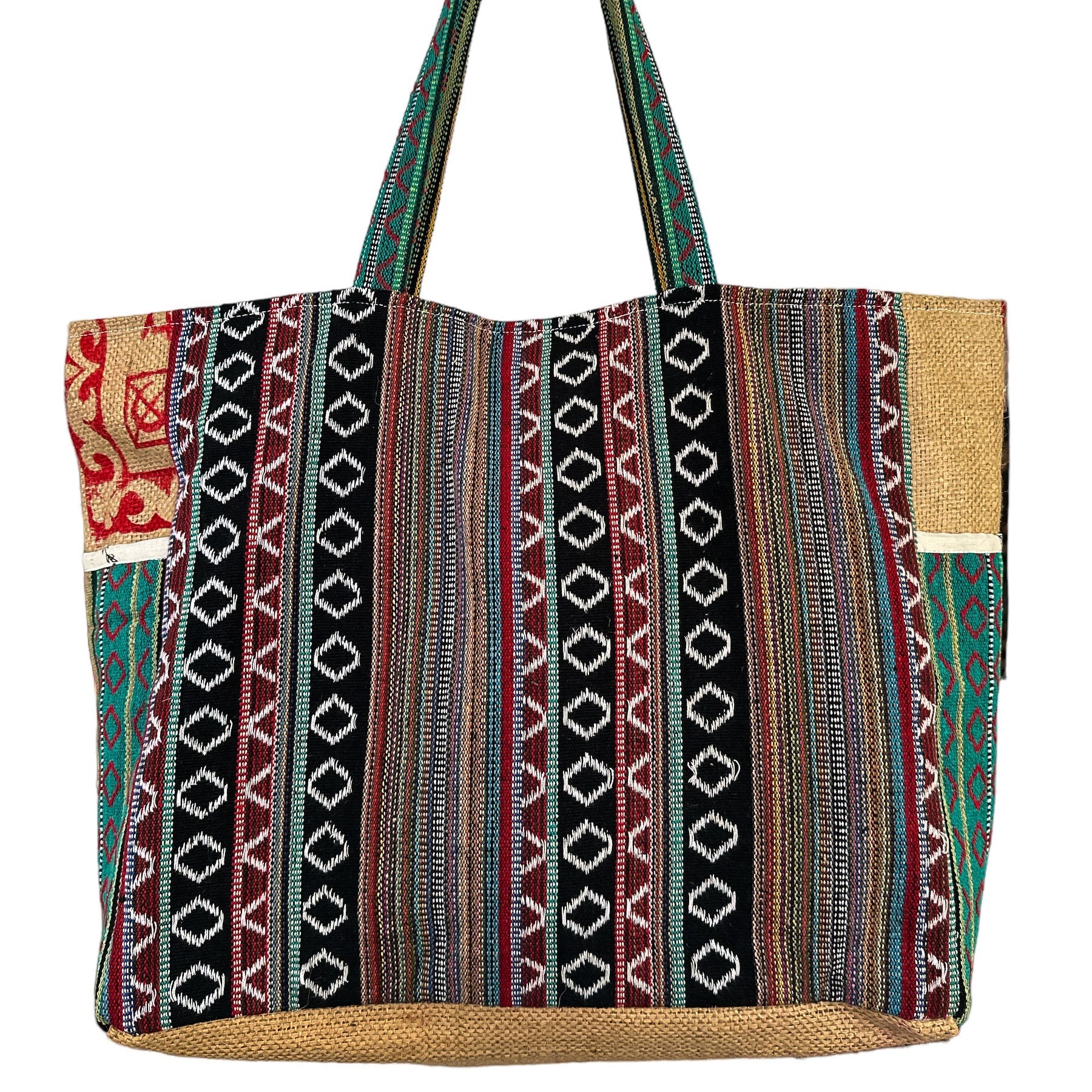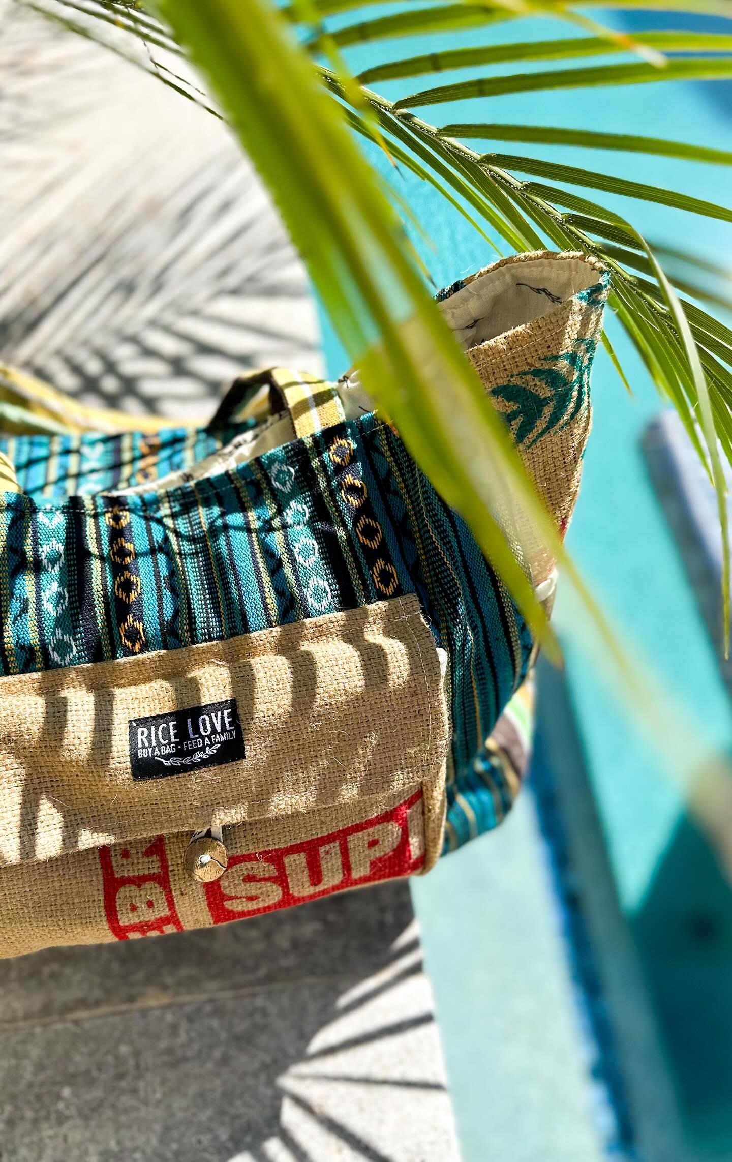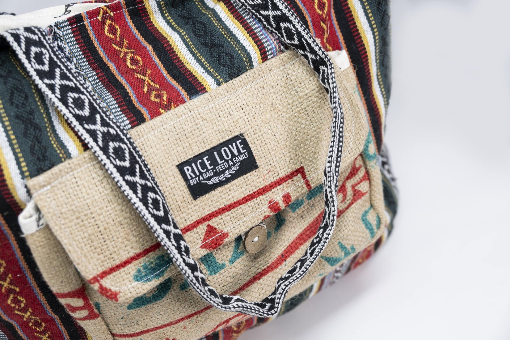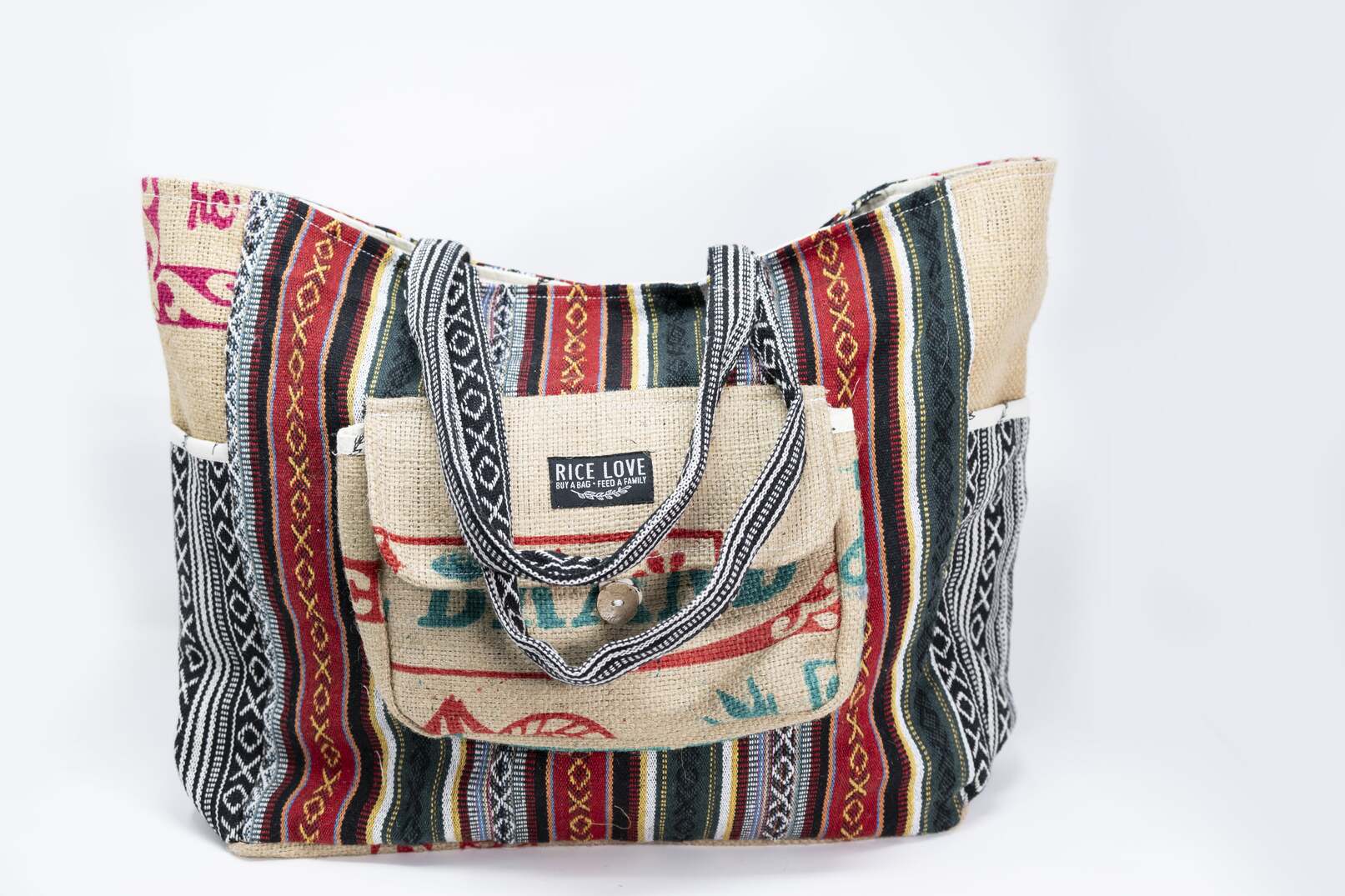 Every tote is one-of-a-kind! The burlap pieces are recycled from authentic Indian rice bags. Expect slight imperfections. Between fabric, the seamstress who made it, the family who received the rice, and you, every bag has a different story. You are giving life. You are a part of the story.