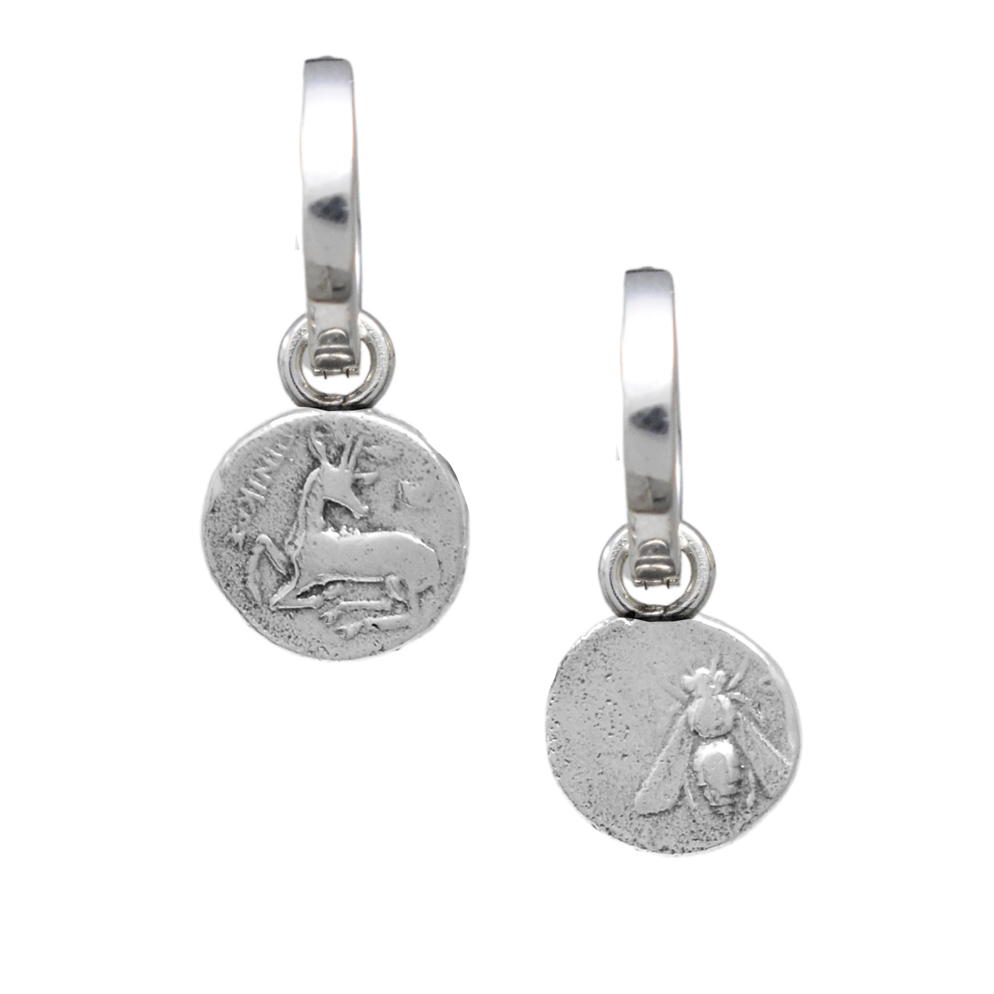 This earring showcases a sterling silver replica of the a tetradrachm coin. The obverse features an intricate bee, representing industriousness, while the reverse depicts the elegant stag deer, symbolizing Artemis, goddess of the hunt.