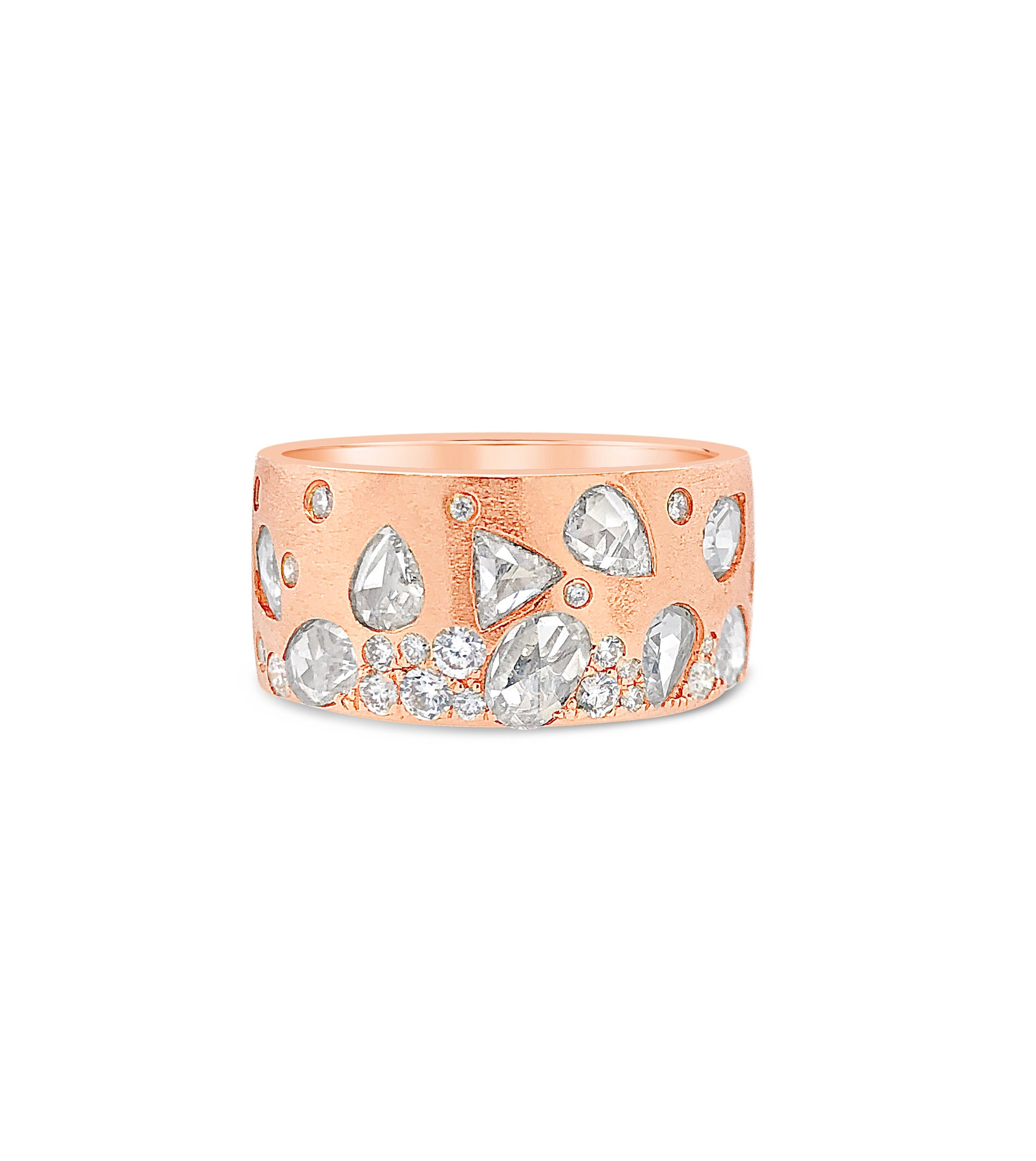 Indulge in celestial elegance and luxury with our Rose Cut Diamond Celestial Band. Brushed 18k gold gives off a subtle shine while the scattered round and rose cut diamonds glisten with every movement. The wide ring adds a bold statement to any outfit. Elevate your jewelry collection today!