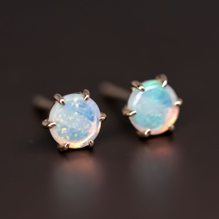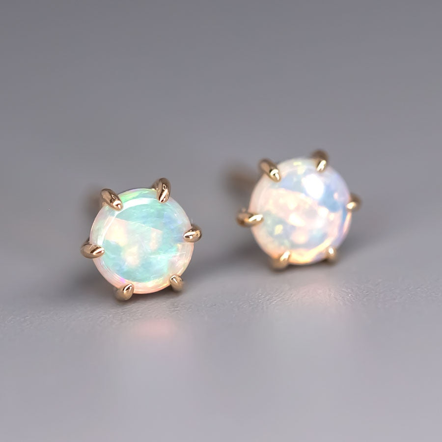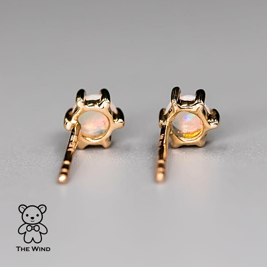 Round Shaped Minimalist Six Prong Australian Solid Opal Stud Earrings 14K Yellow Gold.