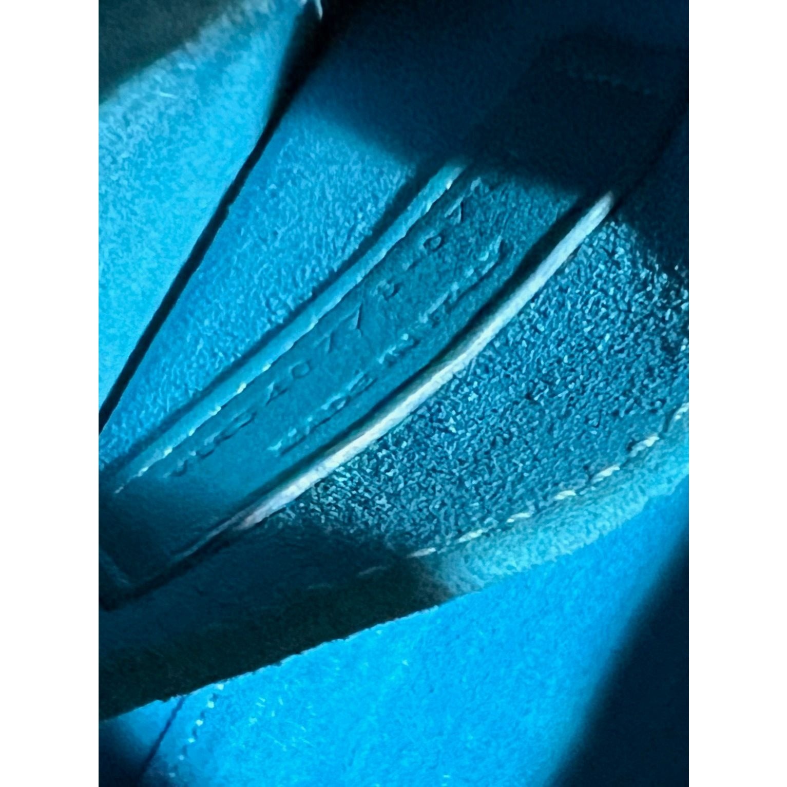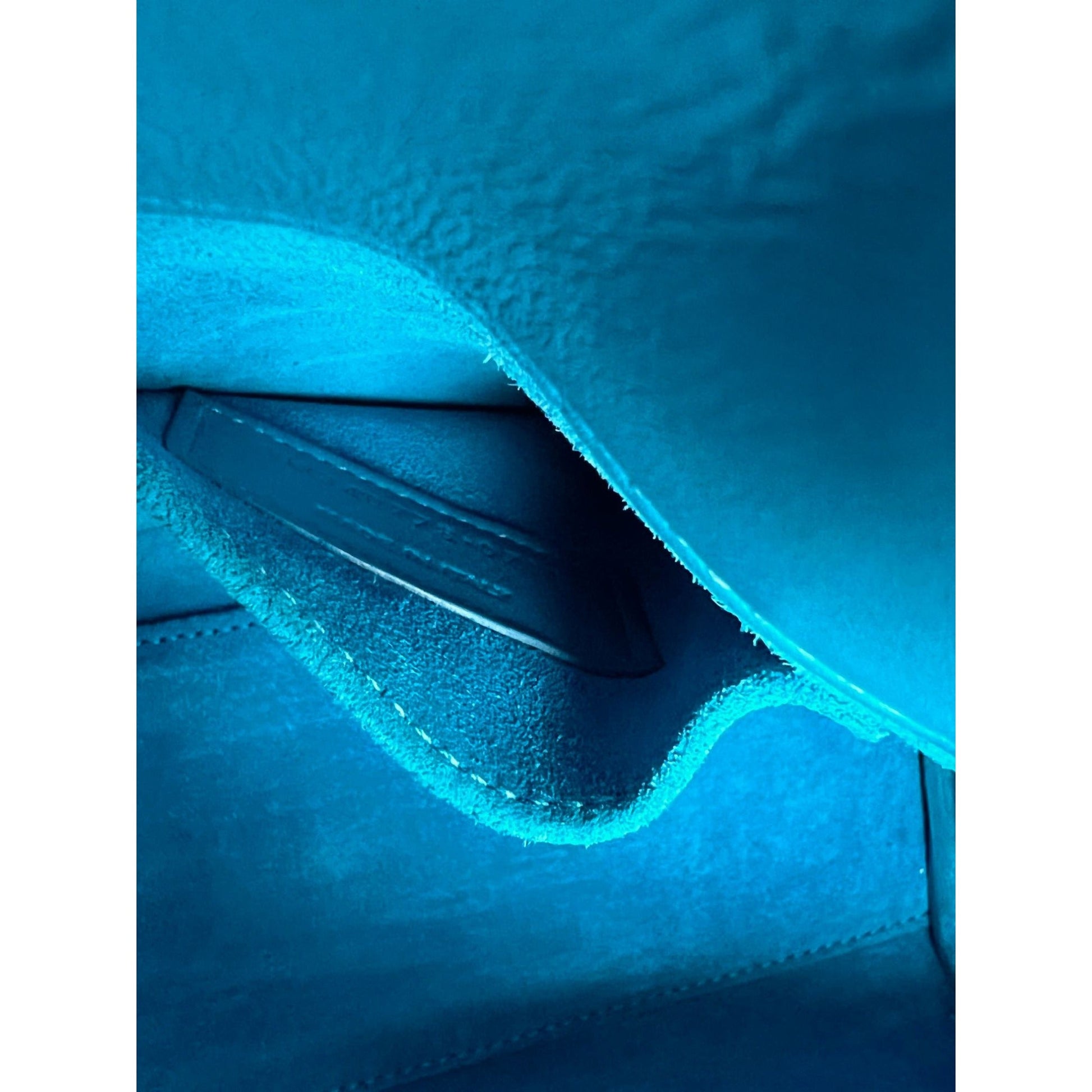 INTERIOR: blue suede, small faint roundish stain on bottom