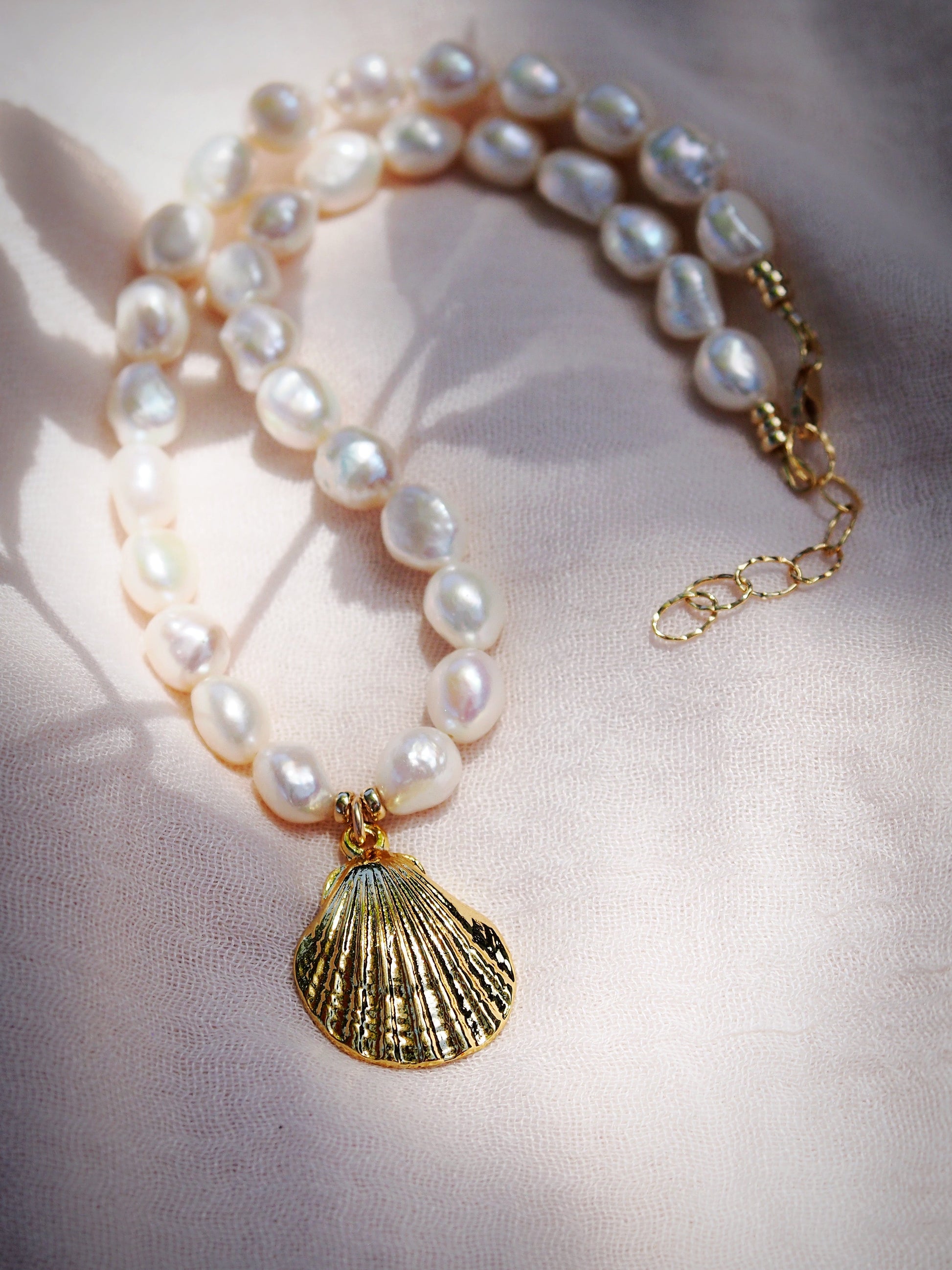 This chunky white freshwater pearl statement necklace evokes visions of Hawaii's white sandy beaches and reflects Hawaii's natural abundance. It features large freshwater pearls and a stunning gold shell pendant. This unique beauty is ready for you and your tropical escape.