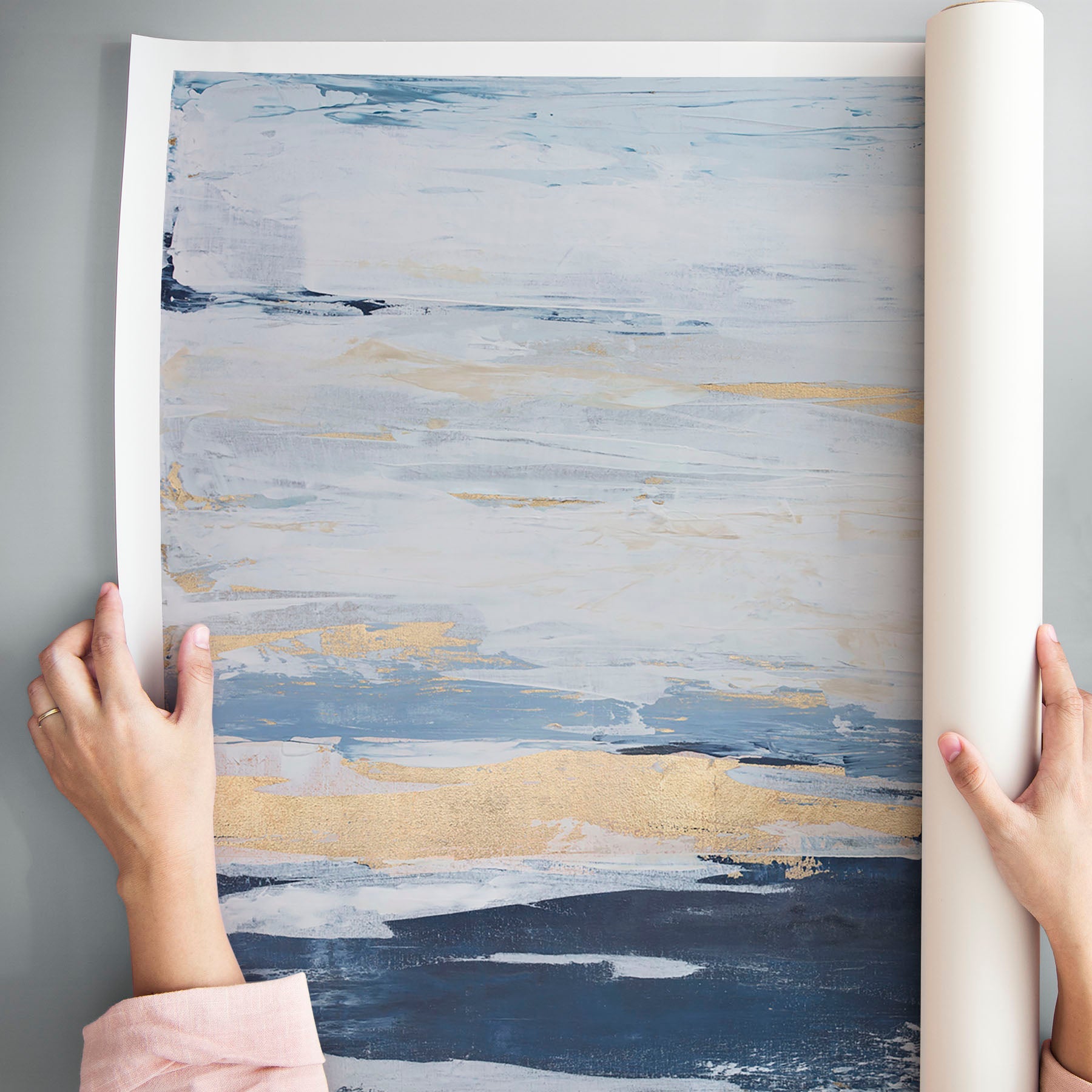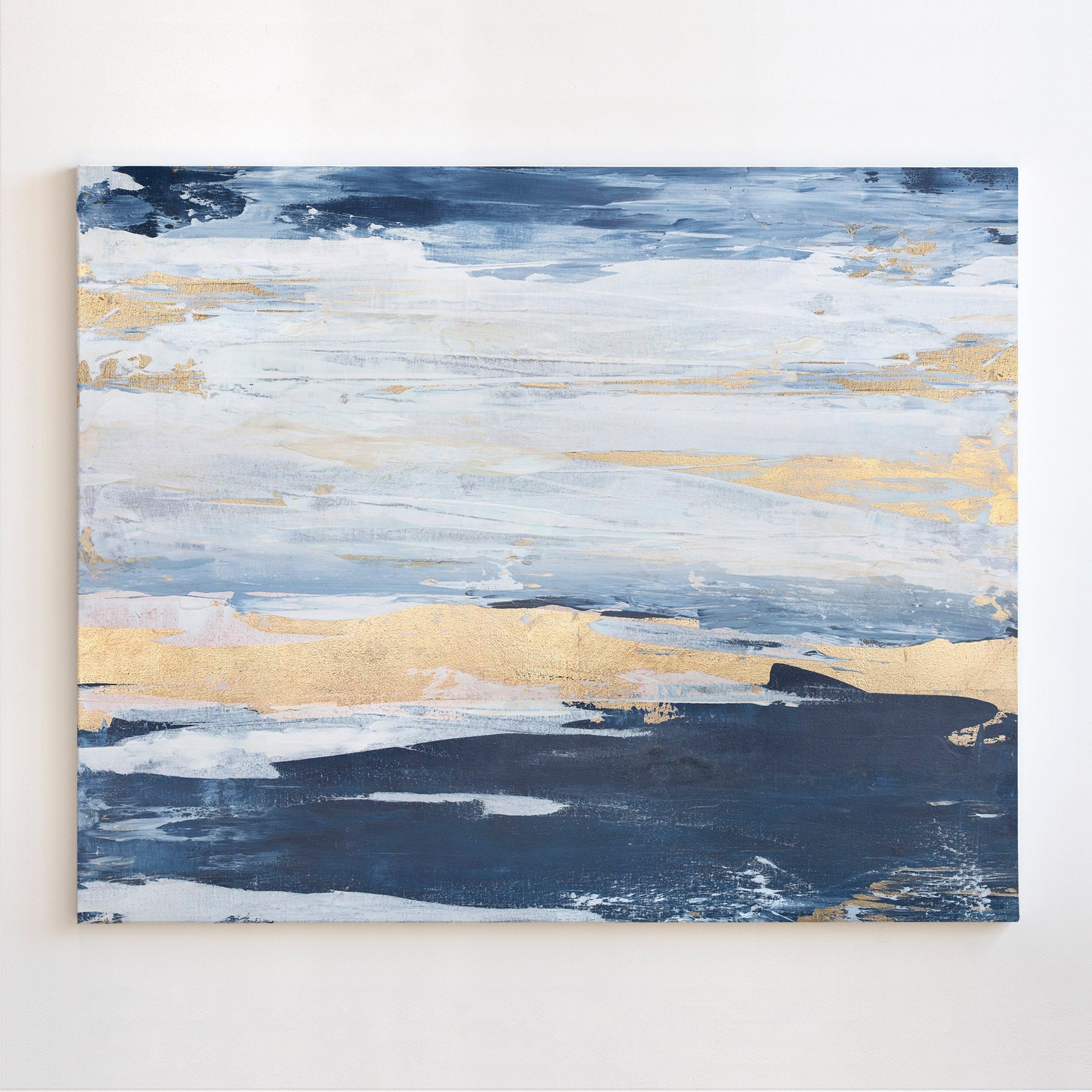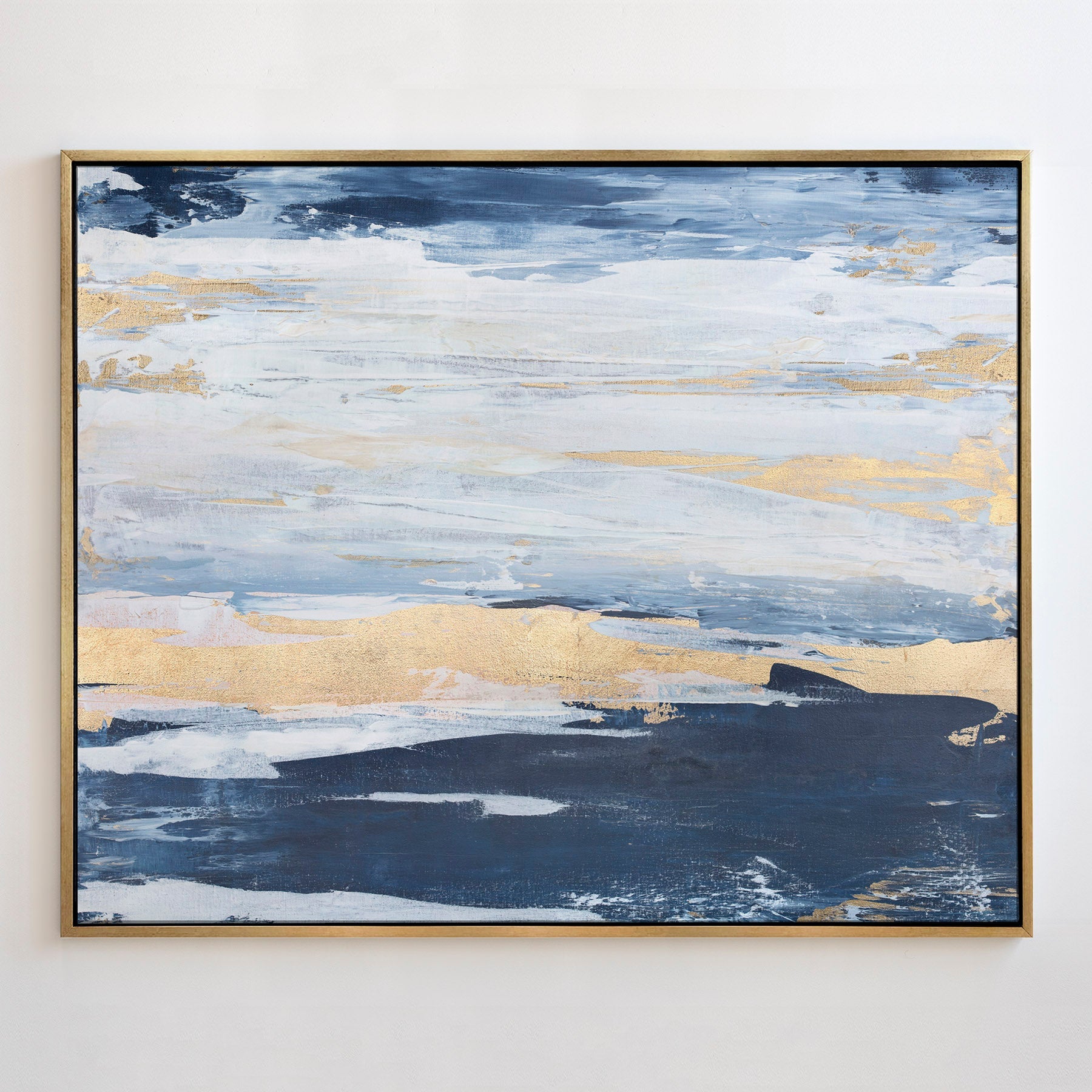 Blue and whites mingle in this coastal abstract print with pops of gold to add interest.
