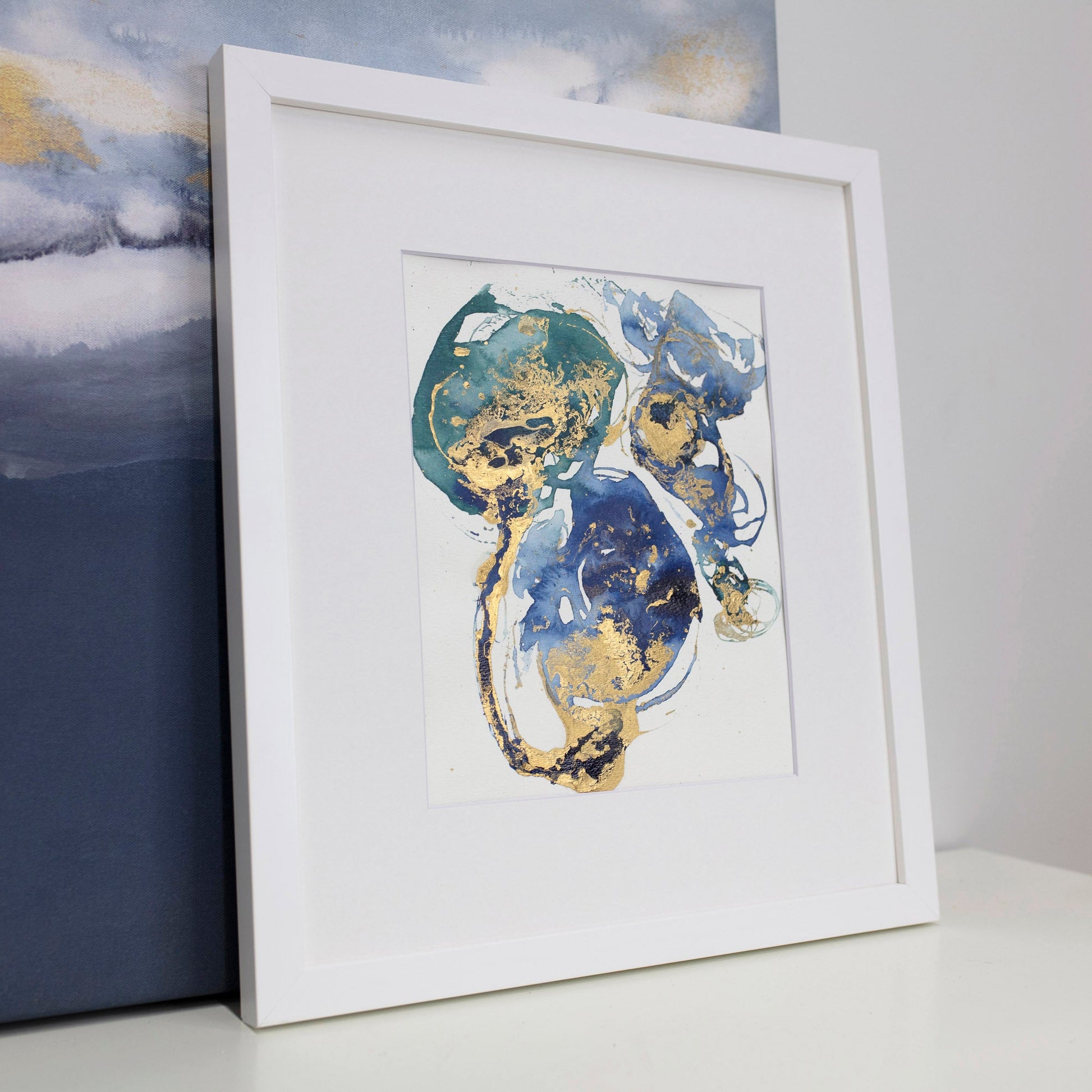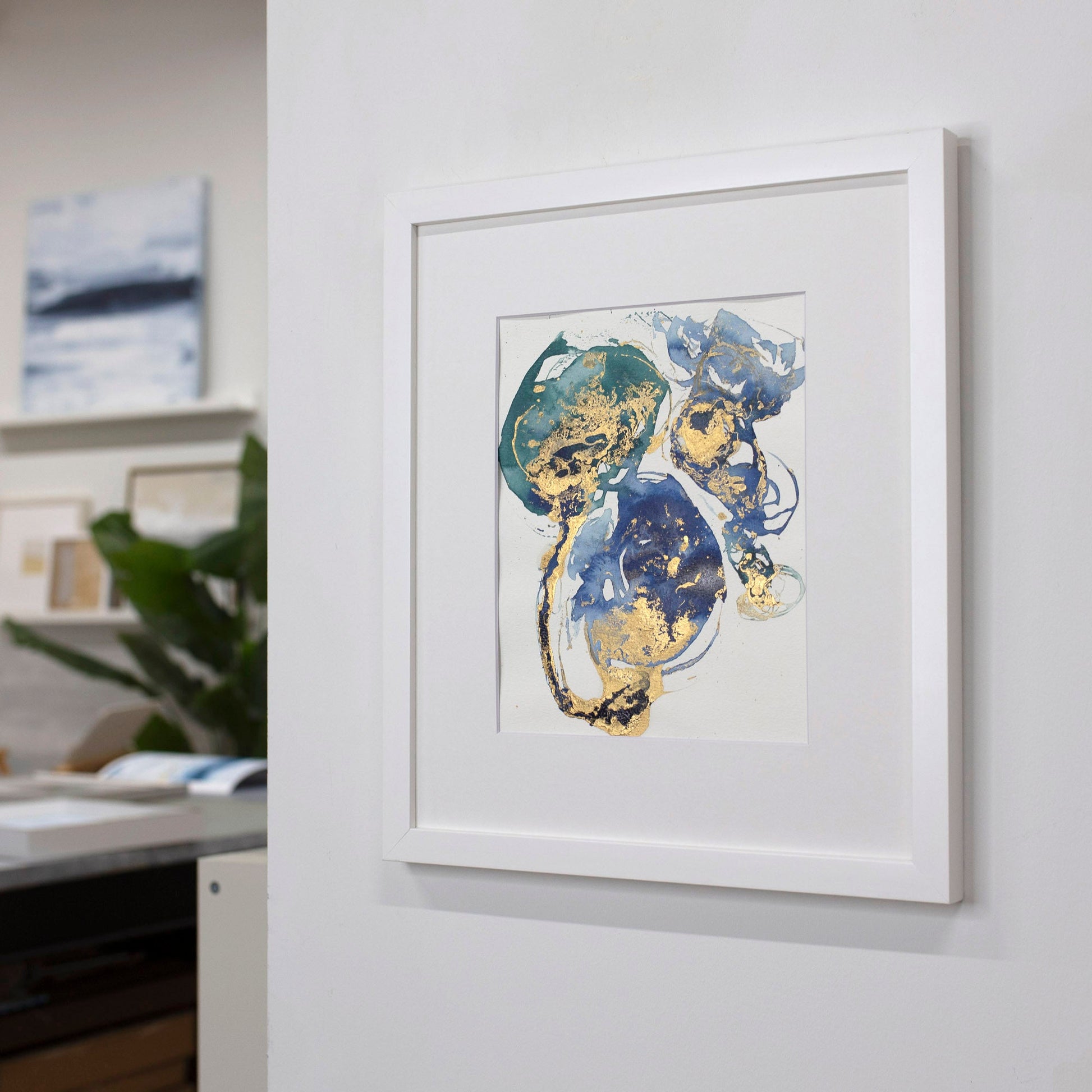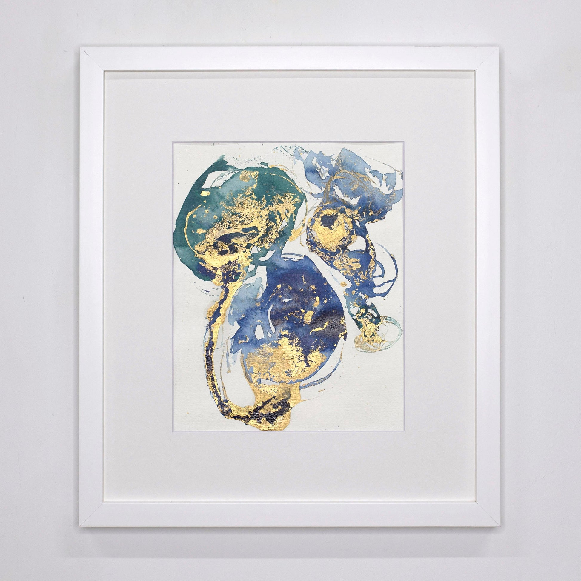 A lively interplay of movement and light, Samba captures the spirit of rhythm and spontaneity through fluid brushwork and dynamic composition. Deep blues and rich greens swirl across the paper, accented by shimmering touches of metallic gold that seem to dance in the light. The organic forms and expressive lines evoke the energy of music in motion, embodying both elegance and vibrancy.