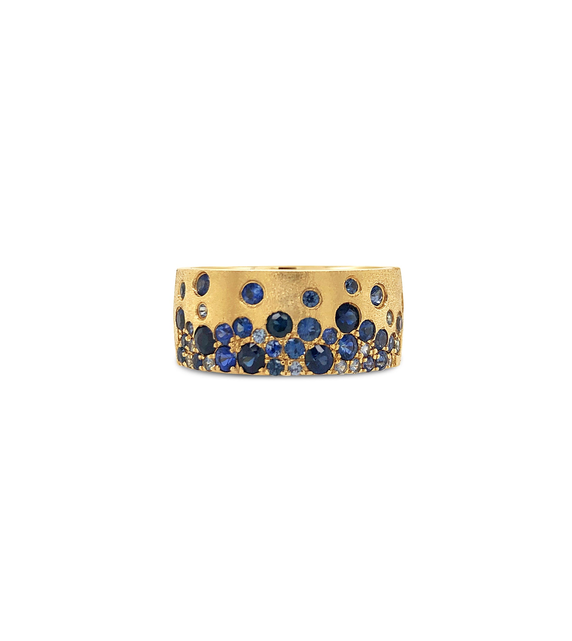 The Sapphire Celestial Cigar Band is an exquisite piece of jewelry crafted from 14k-gold with a luxurious satin finish and mixed shade sapphires. Celebrate your special occasions with this classic and timeless design that will add a sparkle of elegance and class to any look.