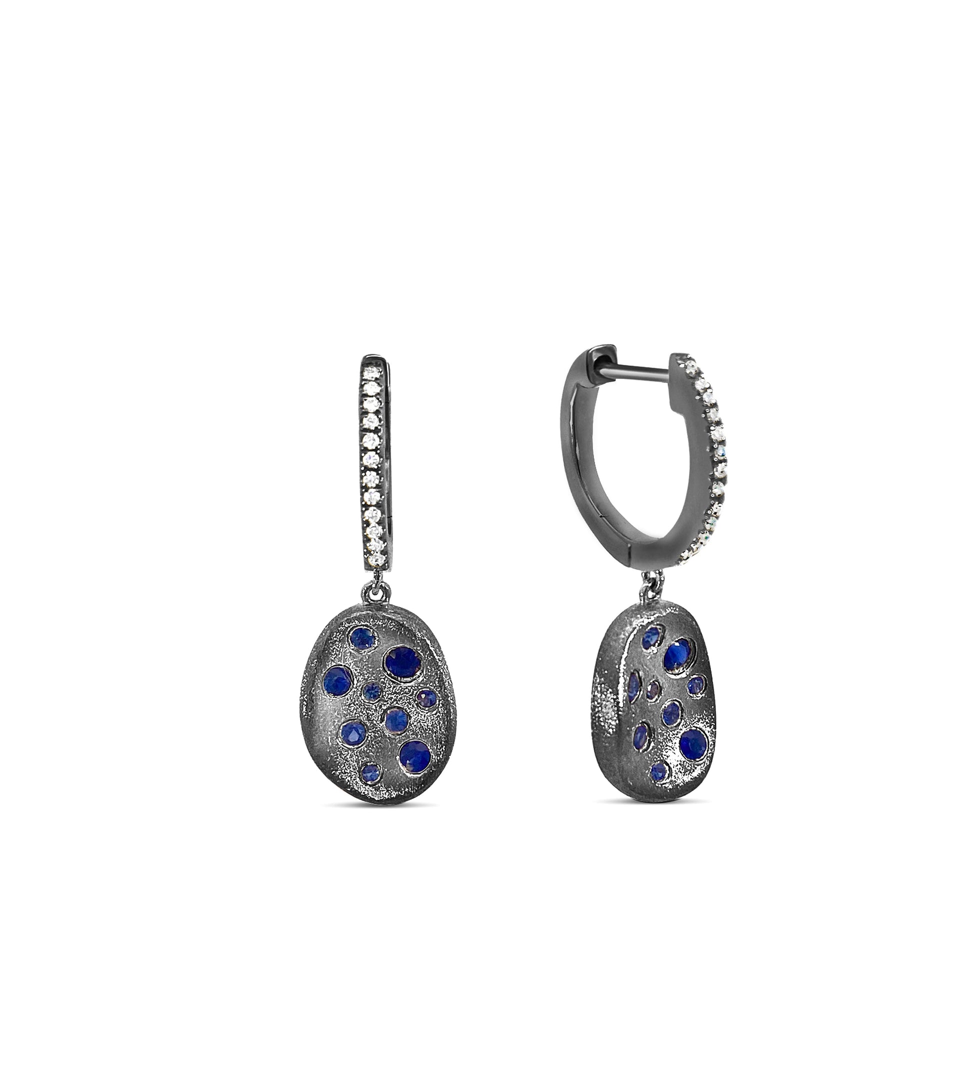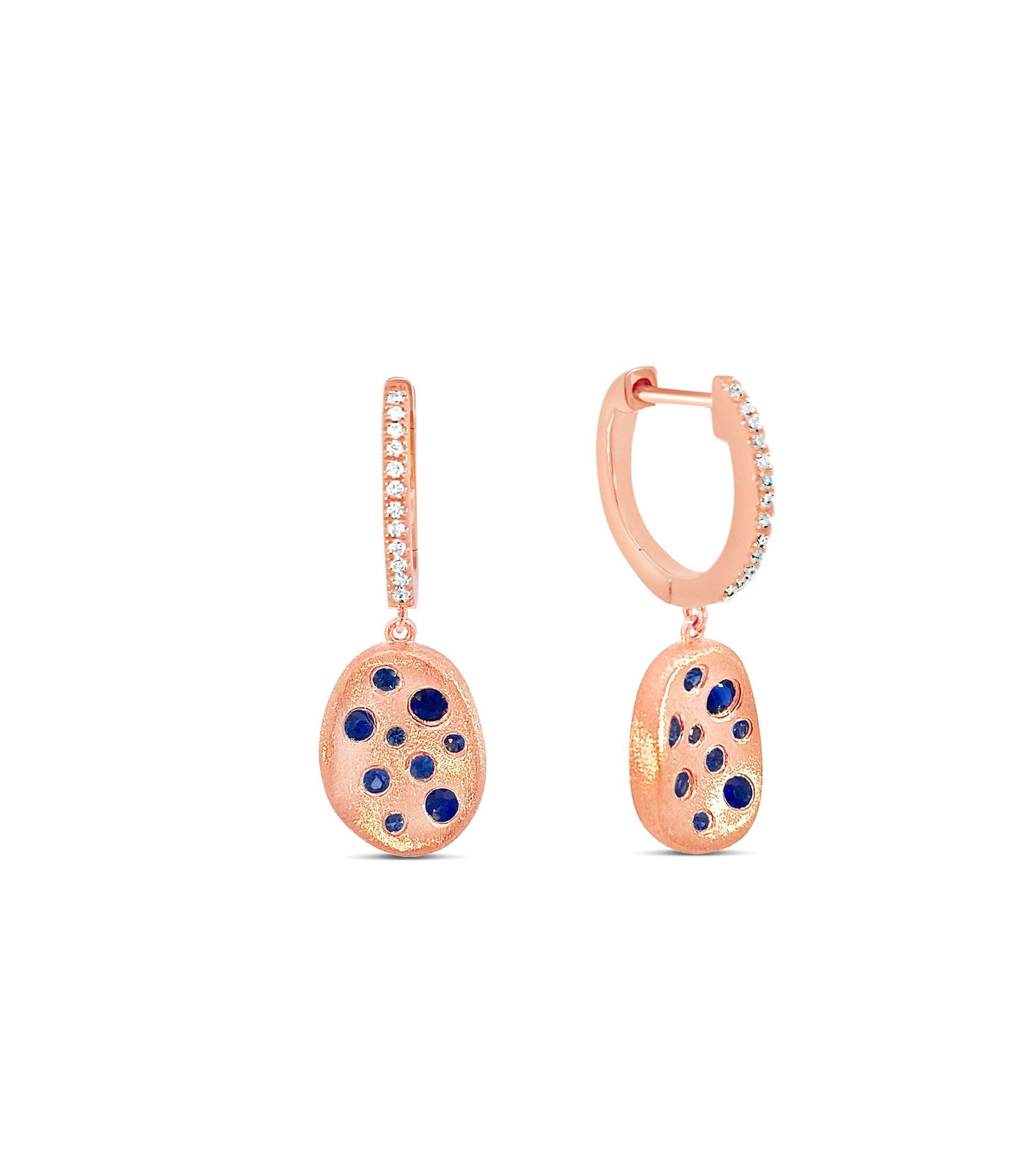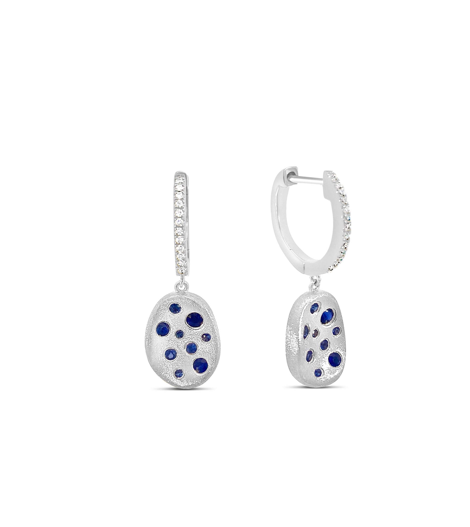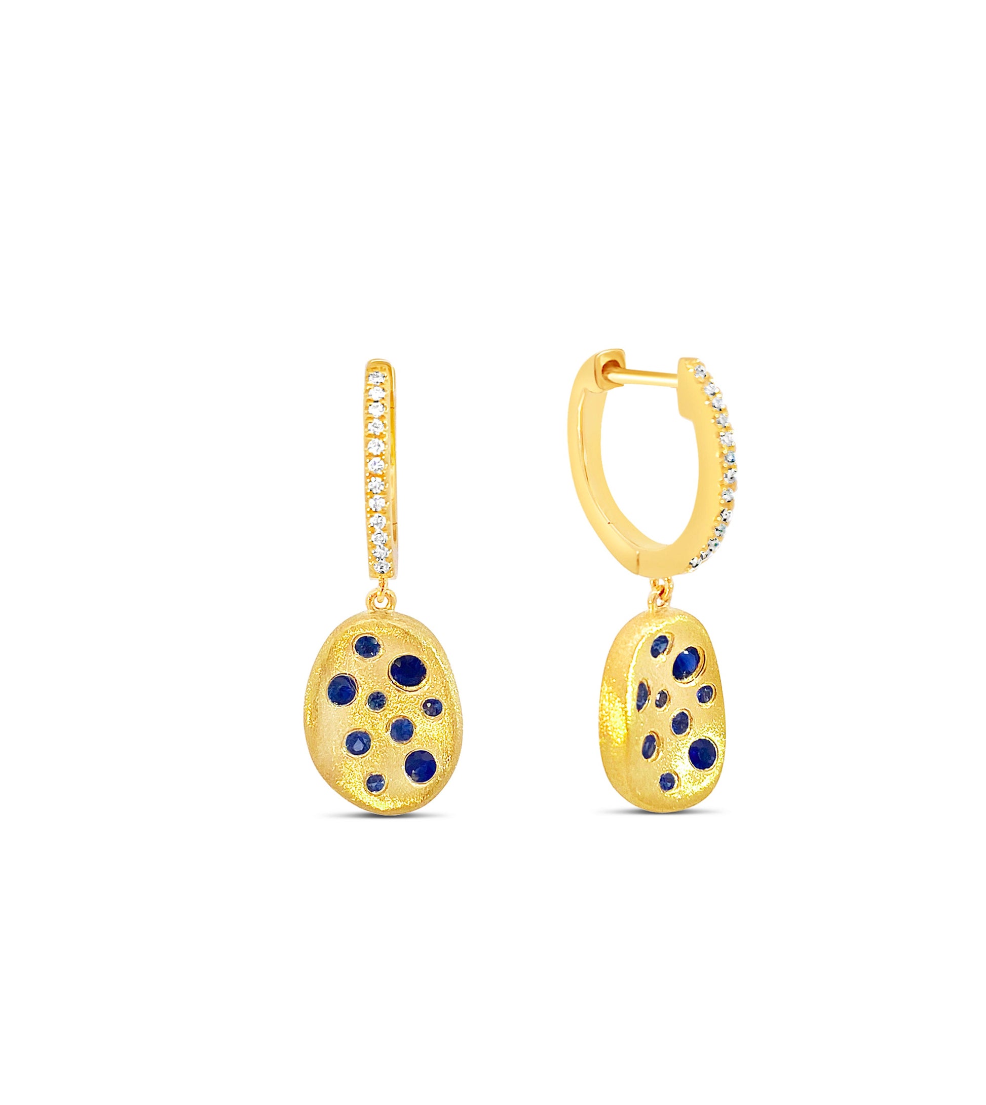Be captivated by the Sapphire Celestial Concave Earring. Crafted with a 14k gold brushed finish and scattered sapphires, this earring is sure to bring admiration. An elegant diamond hoop tops off the design with an exquisite free form drop. Let yourself be enchanted by the beauty of these earrings!