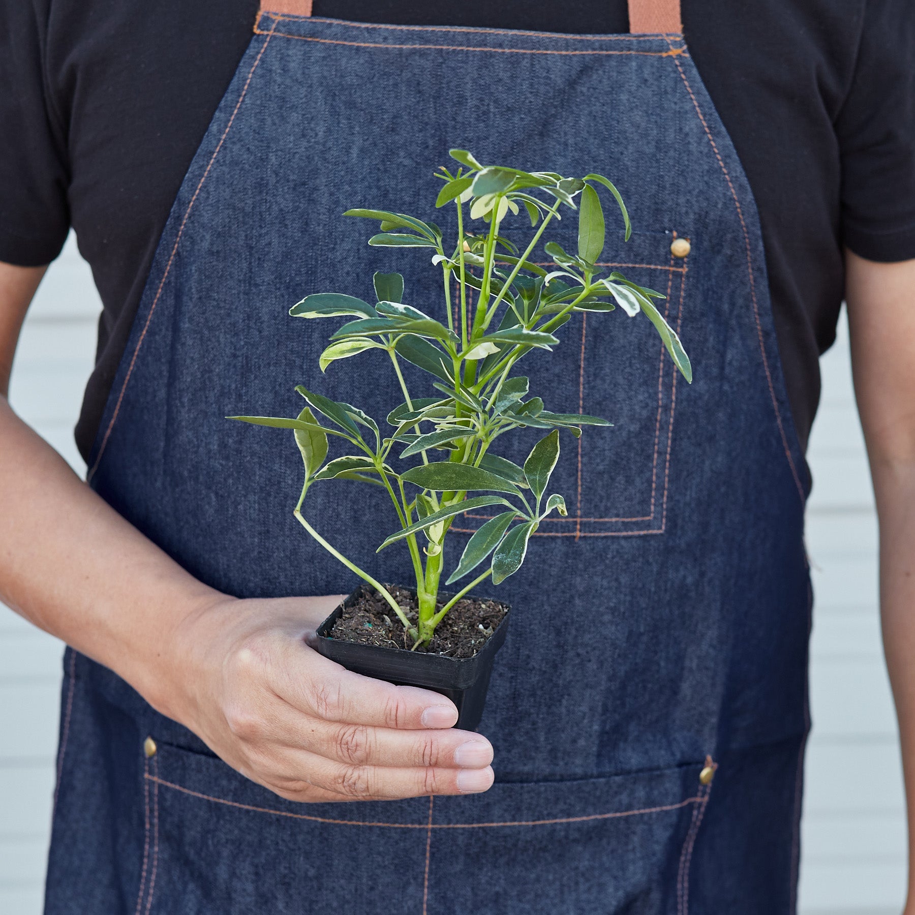 - Description: The Umbrella plant is the dwarf version of the larger schefflera acrinophylla native to Taiwan. This evergreen wields very slender stalks with oblong leaves arranged in a circular fashion at the end of each stem. This particular variegated variety will have splashes of washed out yellow on many of its leaves.