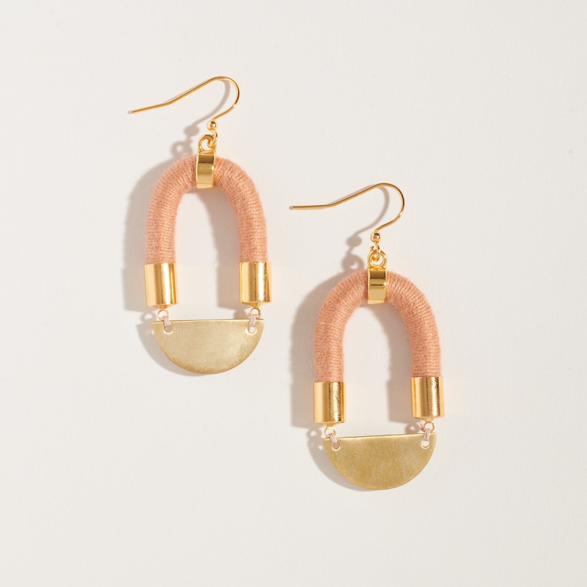 The Shortened Earrings are a variation of the Elongated Earrings, based on requests from our community! Modern textile earrings with brass accents. Shown in Latte Cotton and modeled in a different colorway for scale only.