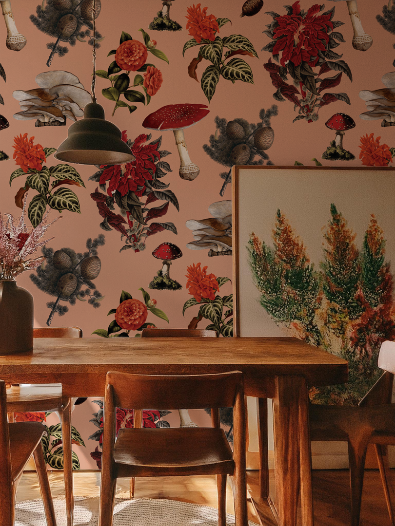 Transform your home into a whimsical and botanical paradise with the Shrooms wallpaper. Featuring beautiful vintage illustrations collaged together by Samantha Santana, this wallpaper is a must-have for any plant and mushroom enthusiast. Easy to install with both peel and stick vinyl and traditional pasted options, you can create your dream space in no time. And the best part? It's completely removable!