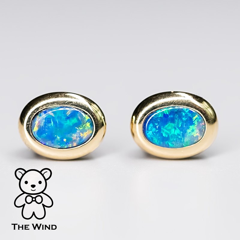 Simple Oval Natural Australian Doublet Opal Stud Earrings 14k Yellow Gold.