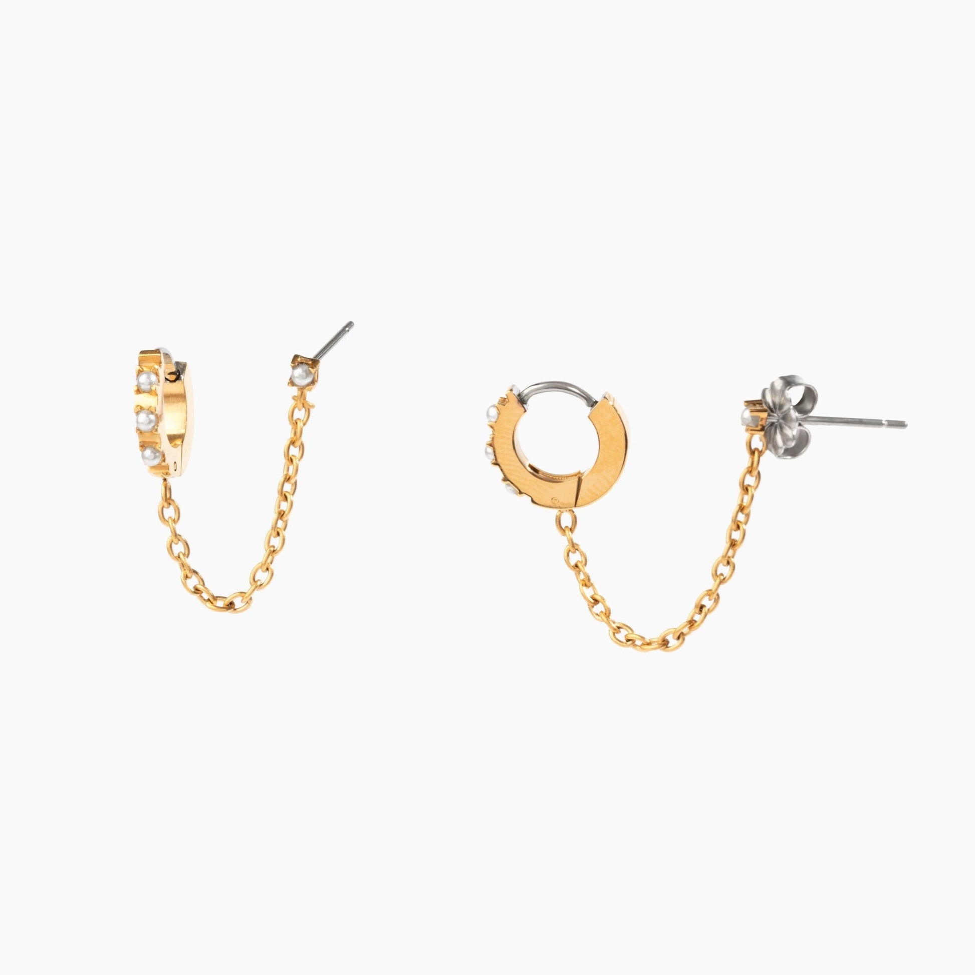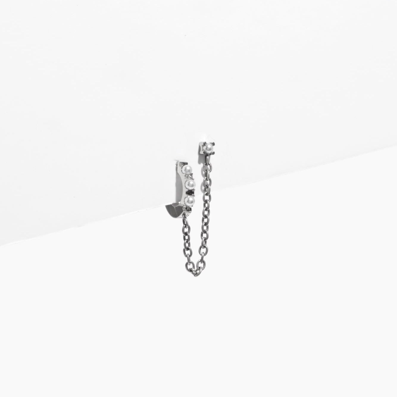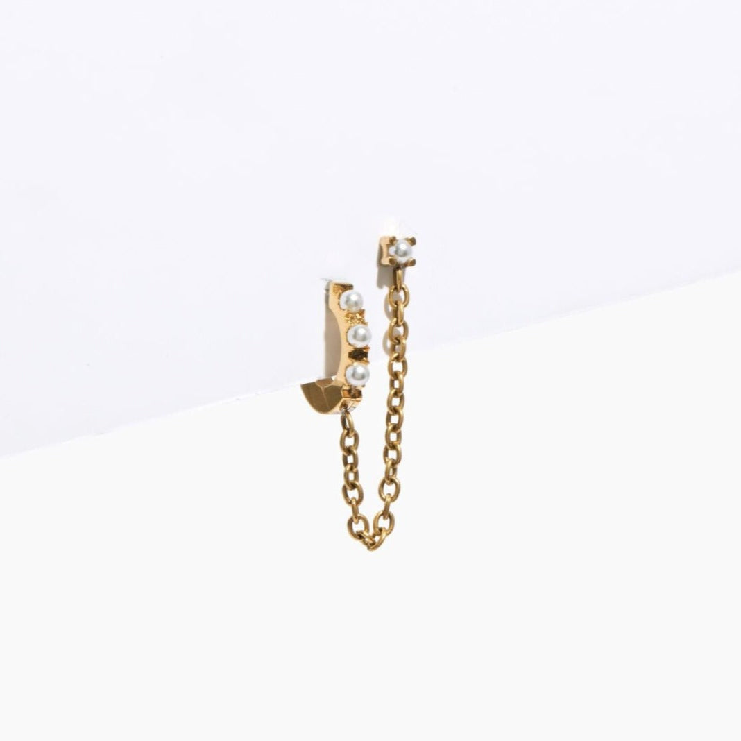 The pearl version of our popular Single Perri Hoop, the Single Lara Hoop, features a pearl hoop and stud connected by a thin titanium chain. The hypoallergenic pearl hoop and stud earrings can be worn in lobe piercings or from lobe to cartilage piercings. Safe for sensitive skin and made with pure medical grade titanium, the dainty and lightweight hoop earring is refined and elevated. Pair with our Pearl Astrid Studs or Leonie Hoops to complete the look.