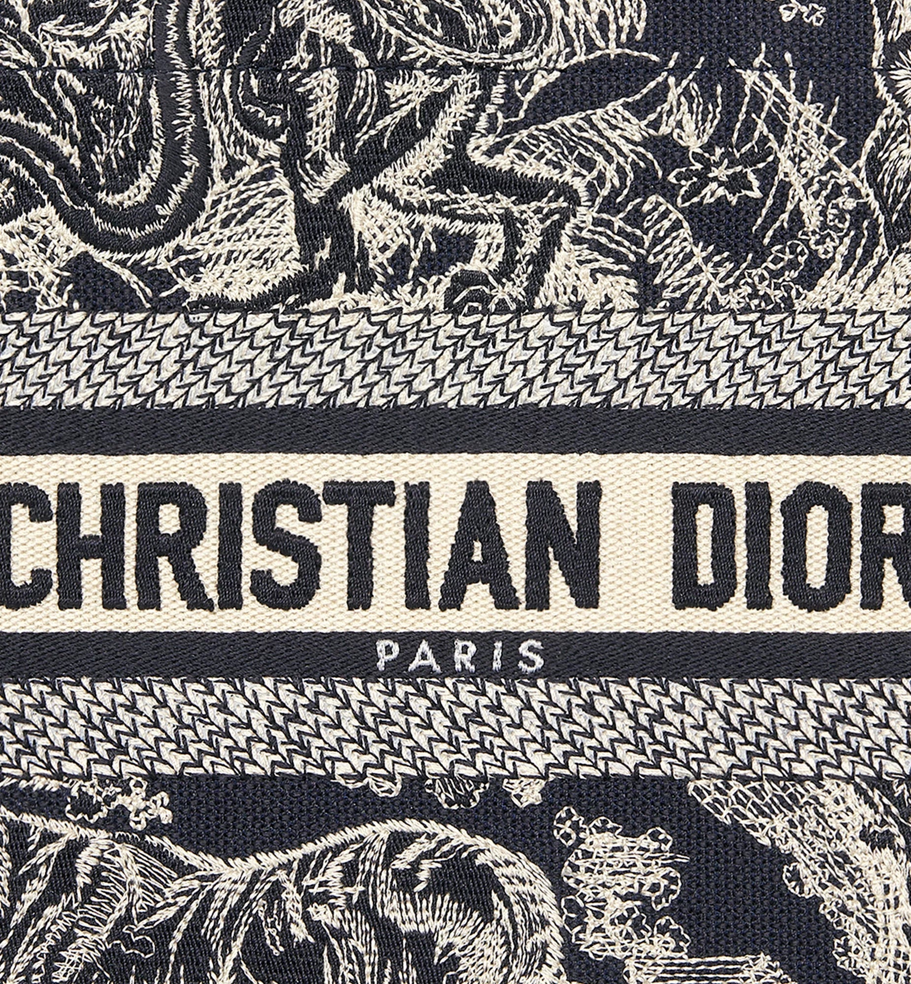 Maria Grazia Chiuri's hallmark Dior Book Tote is offered in an elegant variation. The refined style combines blue calfskin with the iconic blue and ecru Toile de Jouy Reverse embroidery, showcasing the iconic House motif in a play on reversed colors. Designed to keep all the daily essentials organized, the interior is equipped with a zip pocket and slip pockets. Featuring an adjustable and removable shoulder strap, the practical small tote exemplifies Dior's savoir-faire and can be carried by hand or worn over the shoulder.