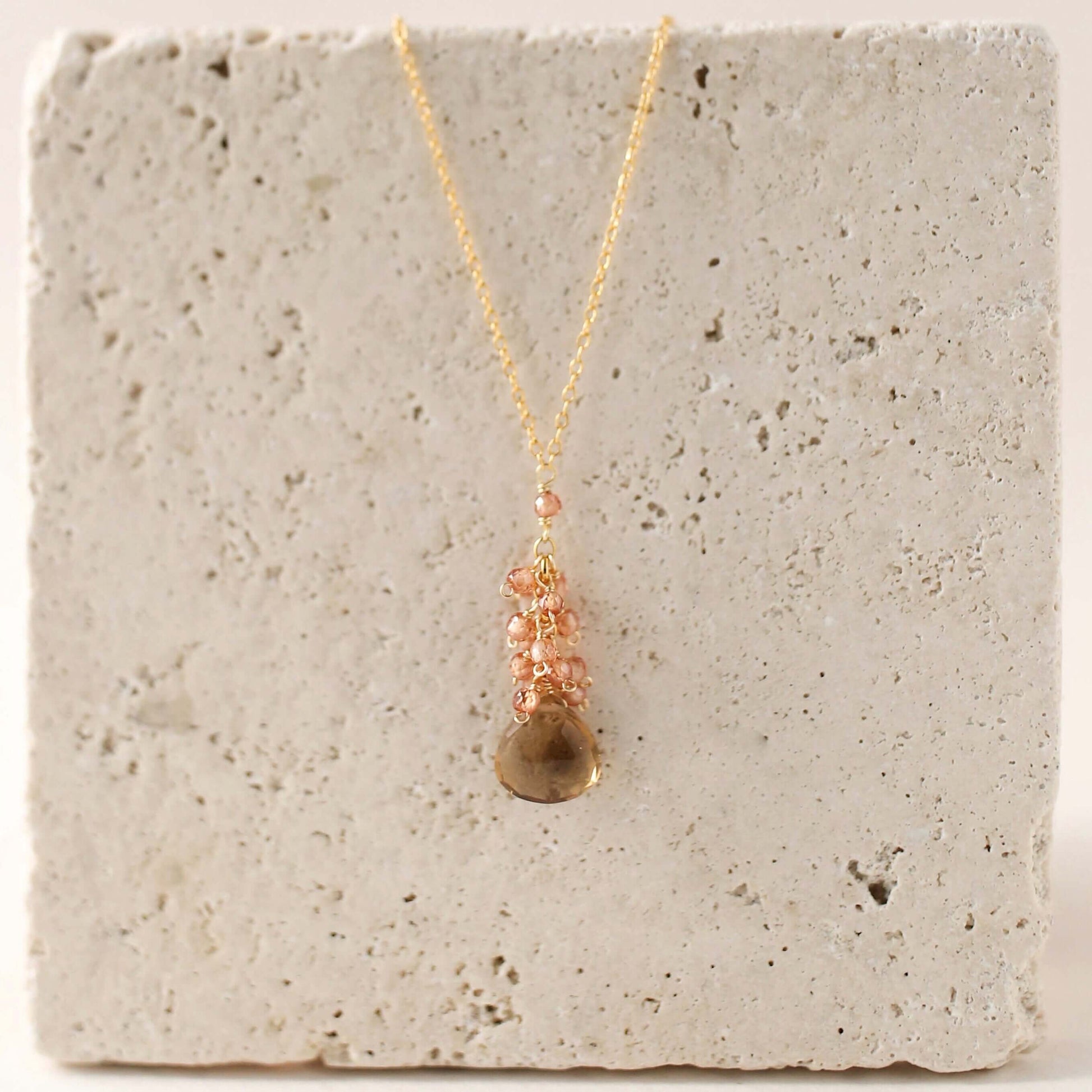 Our floating smoky quartz "raindrop" pendants are absolute neck candy featuring stunning smoky quartz paired with a cluster of mini champagne quartz gems.