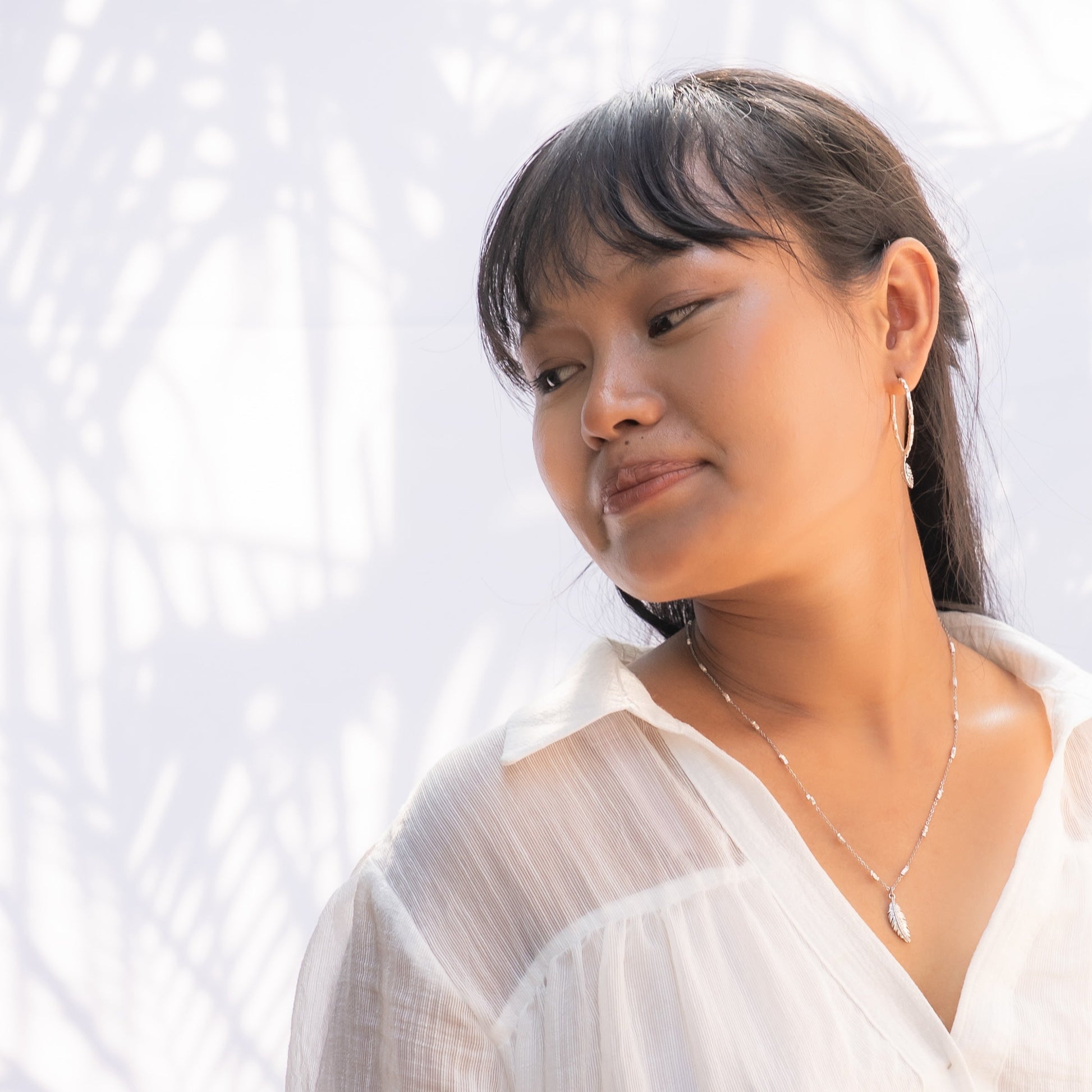 0.27" by 0.75" rhodium-plated brass feather pendant set with white cubic zirconia hanging on 18" long stainless steel chain with a 1.3" extension chain. Chain is adorned with 925 sterling silver beads.