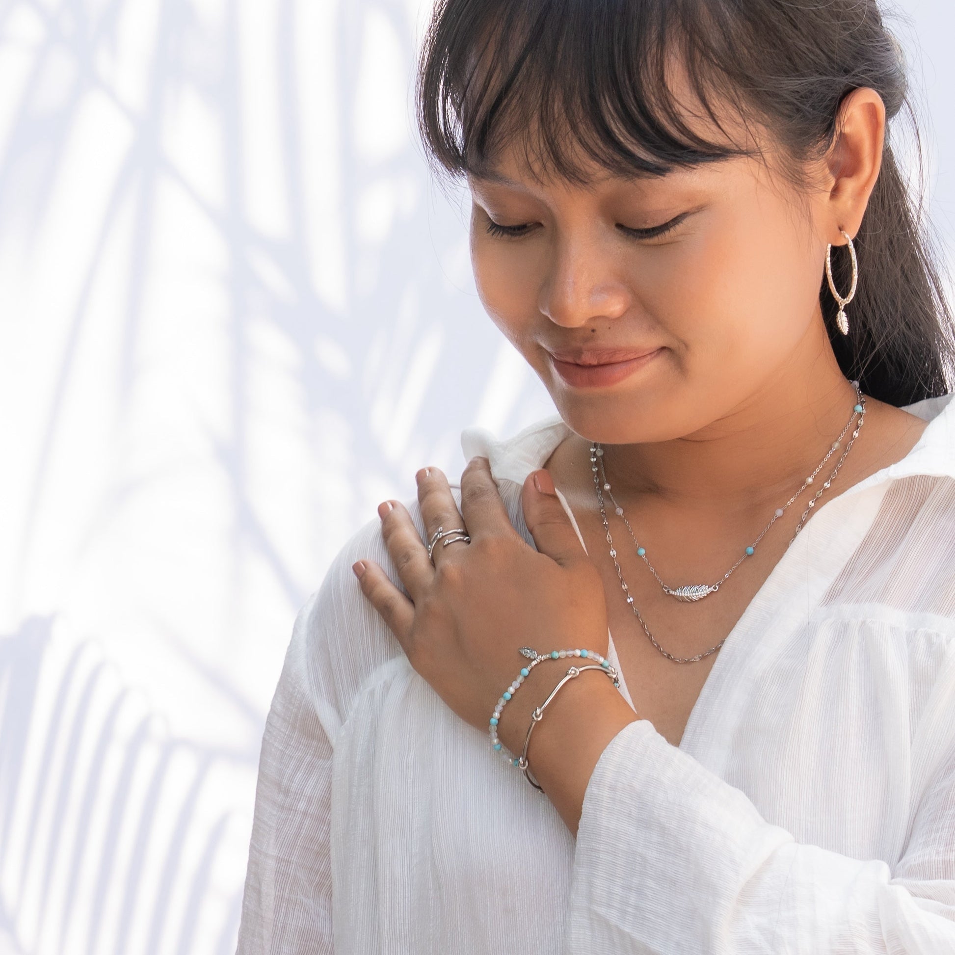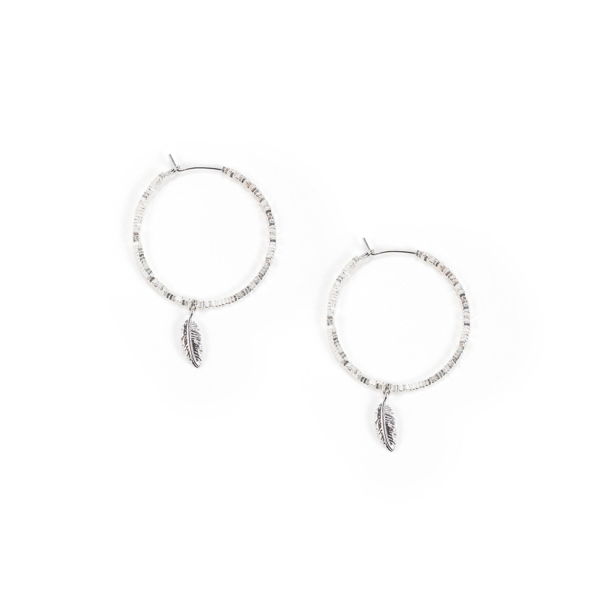 1.2" 316 medical-grade stainless steel hoop with 925 sterling silver beads and feather pendant.