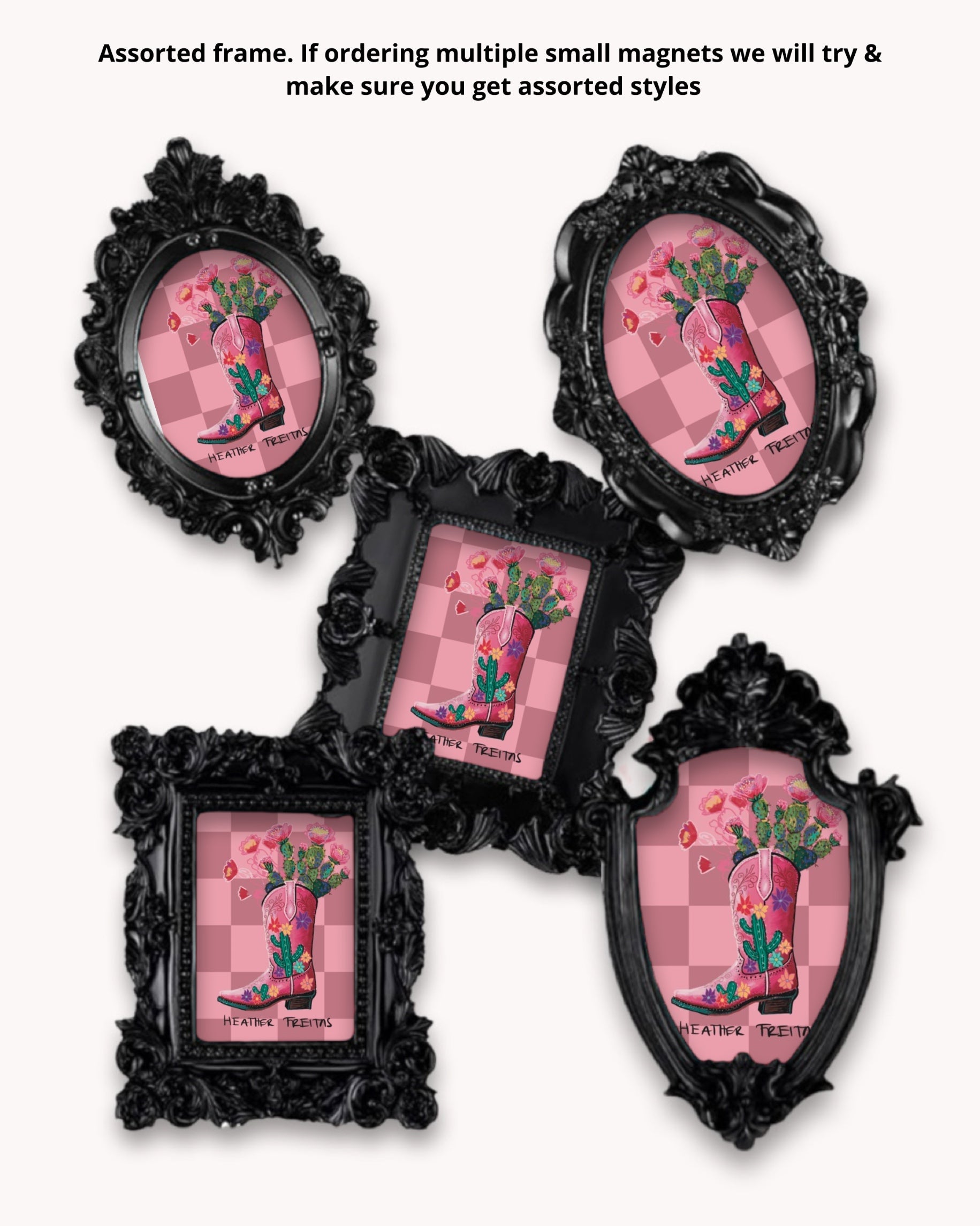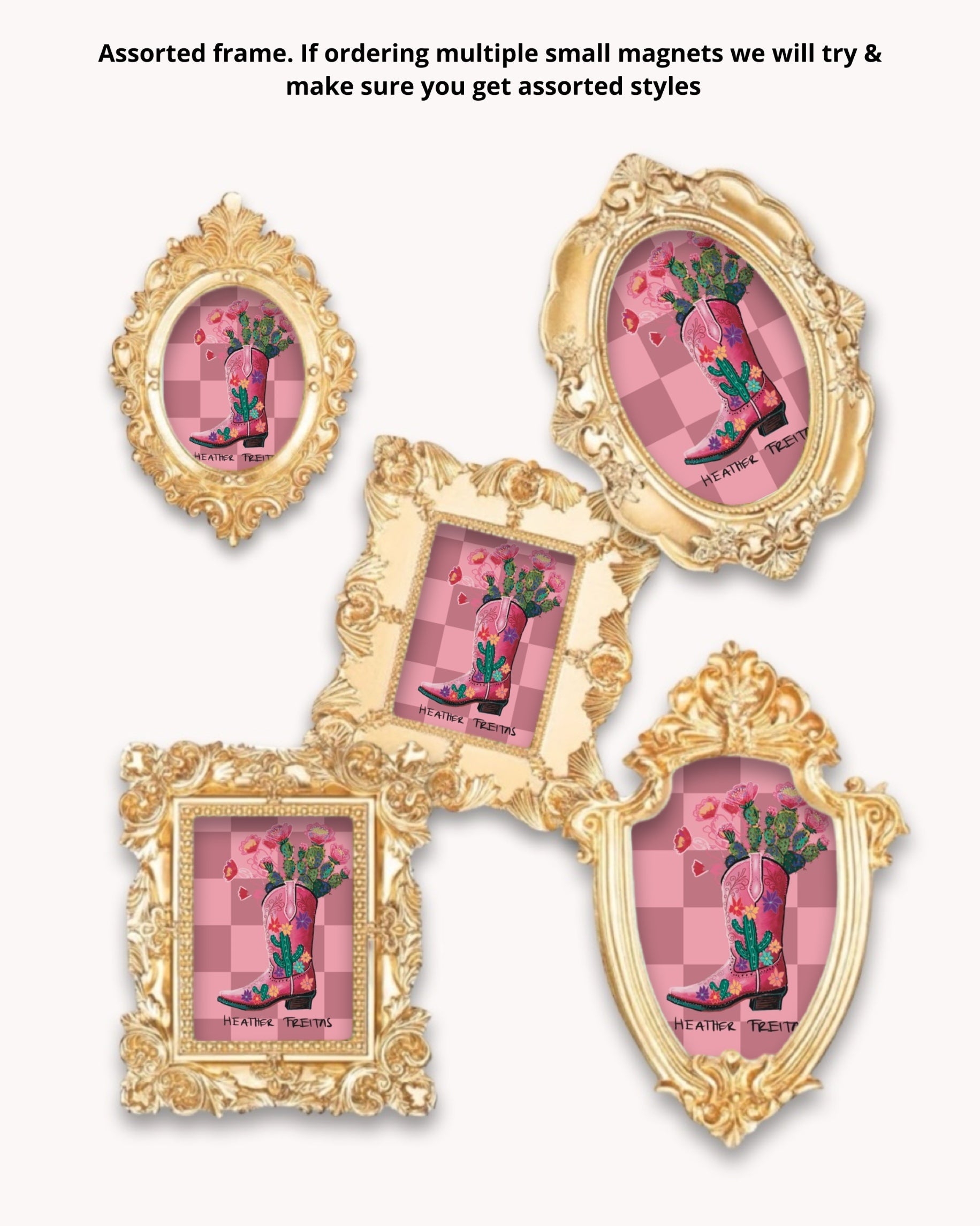 Frame design : Please note magnet frames are assorted. If you order multiple small magnets will will try and make sure you get assorted frames for the cutest mini gallery wall on your fridge. Â