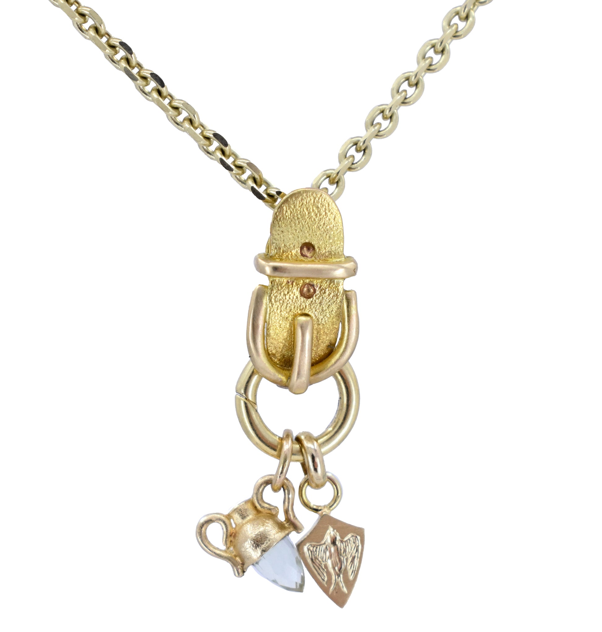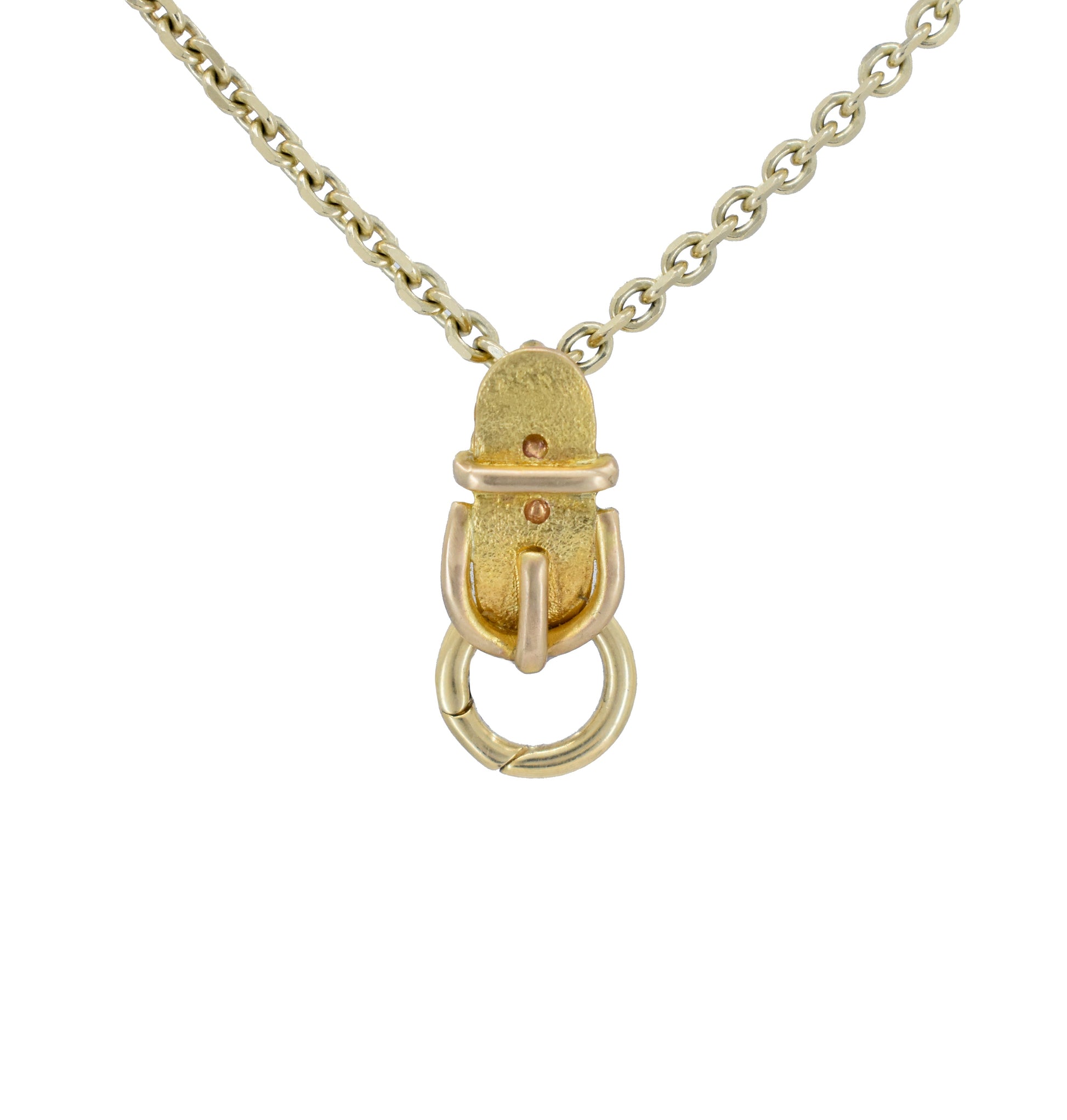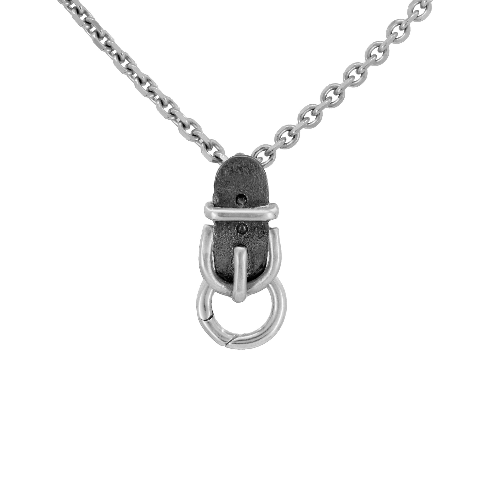 The Stay Strapped Buckle Enhancer is a heraldry-inspired, armor-grade flex—designed to hold your personal arsenal of pendants in one place, your way. Crafted to resemble a heraldic buckle motif, you can slide it on any chain and load it up with your favorite charms, pendants, and keepsakes. The free-hanging circle clasp opens inward to securely hold your personal stack.
