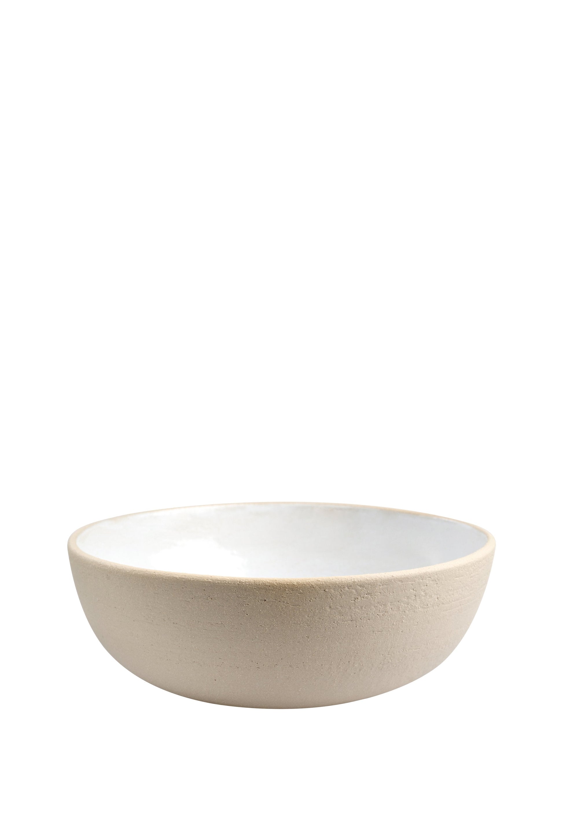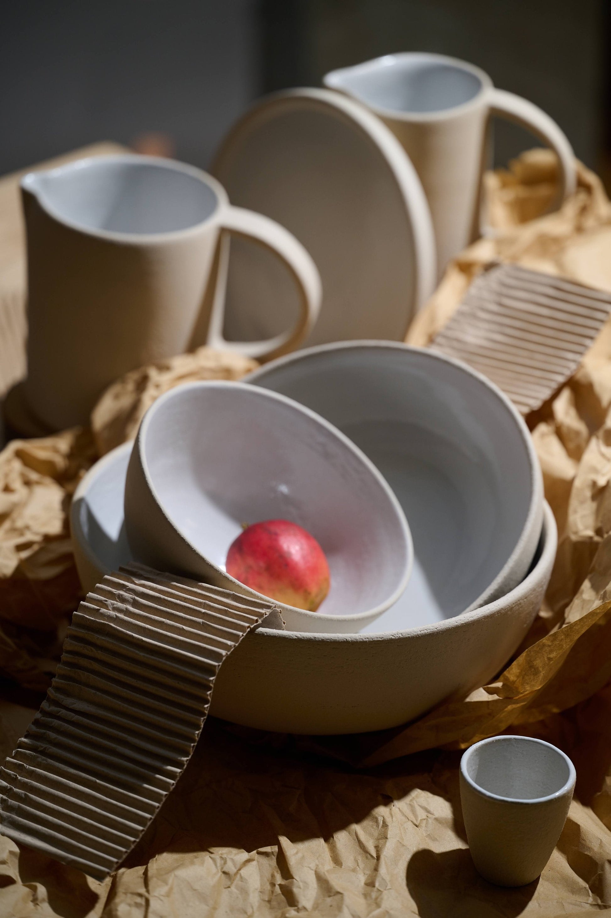 This is the most honest ceramic ware we have ever produced - exposed rough stoneware shows occasional signs of the artisans' fingers that were left during the hand-throwing process. The sides were smoothed but one can still see stoneware pores as if the dinnerware is breathing. The inside is covered with opaque white glaze for convenient use.