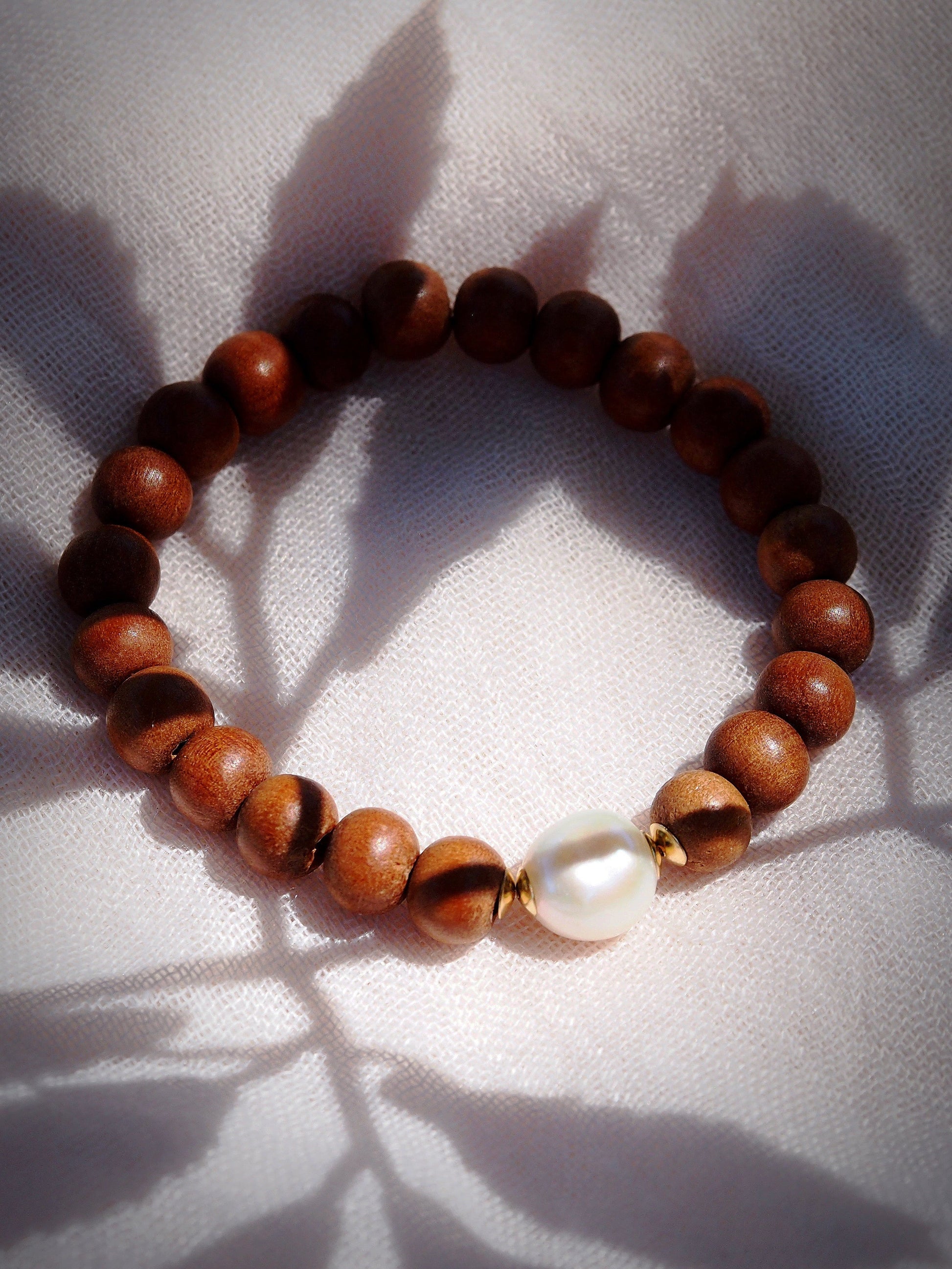 A perfect stacking bracelet. This stretchy bracelet features fragrant wooden beads carved from sandalwood, delicate gold-filled accents, and a single white freshwater pearl for good measure. Bonus: easy on and off because it's stretchy!