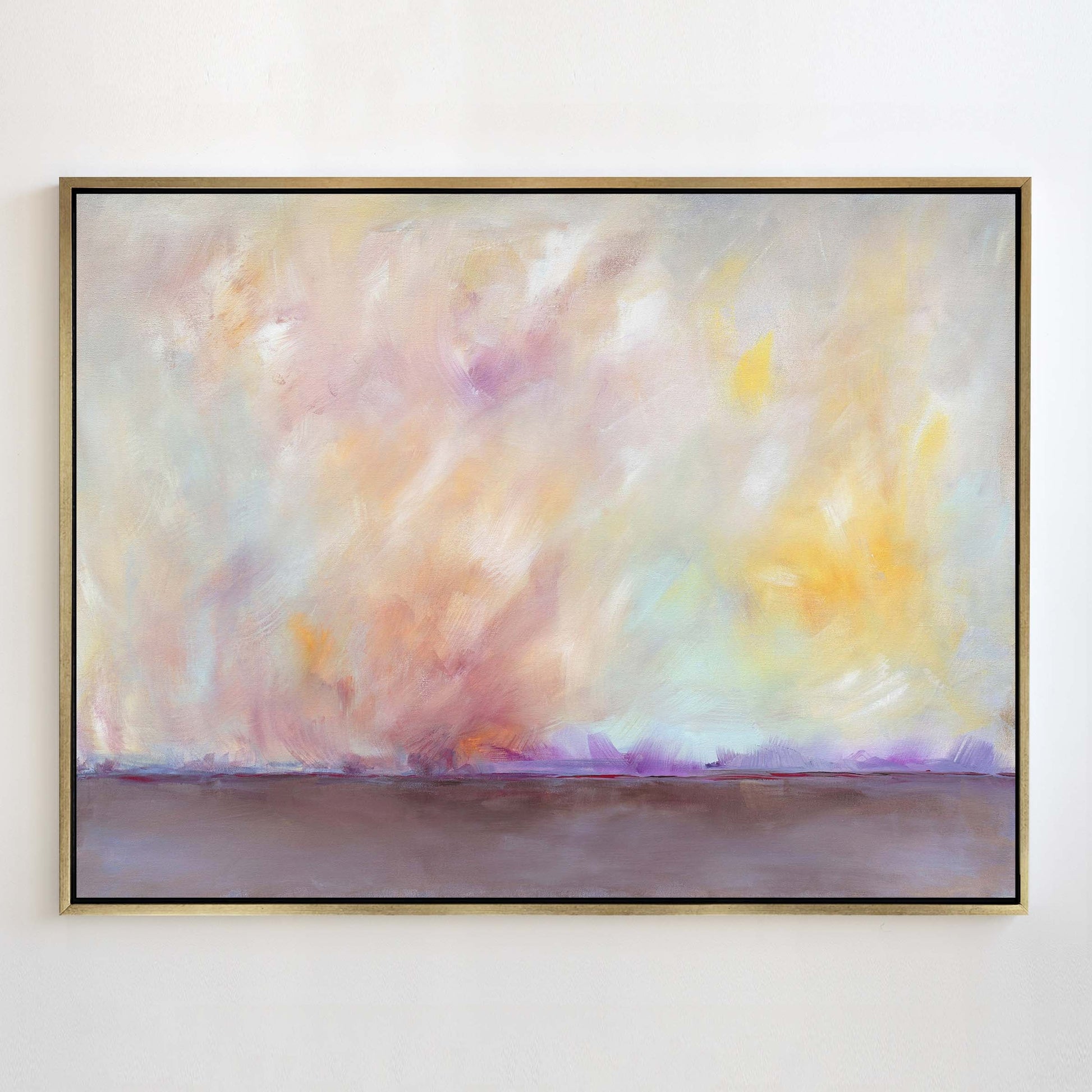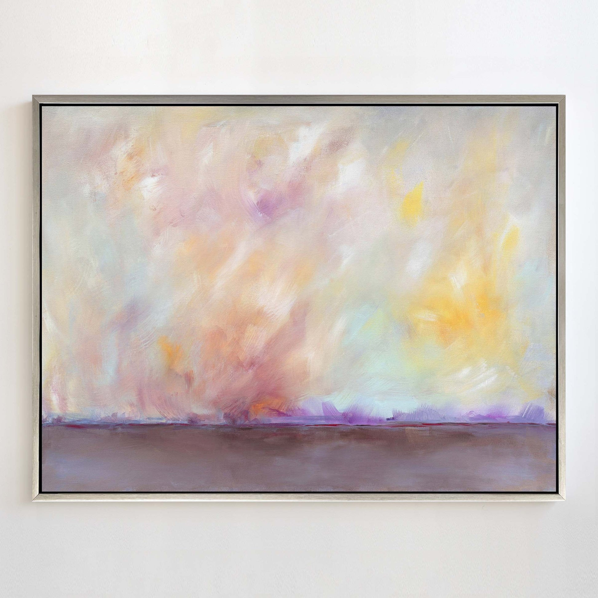 A bright, abstracted landscape bursting with energy and movement. Soft, airy hues dance across the canvas, blending warm tones with fresh blues and crisp whites—like sunlight filtering through a breezy sky. This piece captures the feeling of a carefree summer day, where the wind carries whispers of warmth and possibility. With its dynamic brushwork and luminous color palette, Sugar Breeze brings a refreshing vibrancy to any space, evoking both joy and serenity.