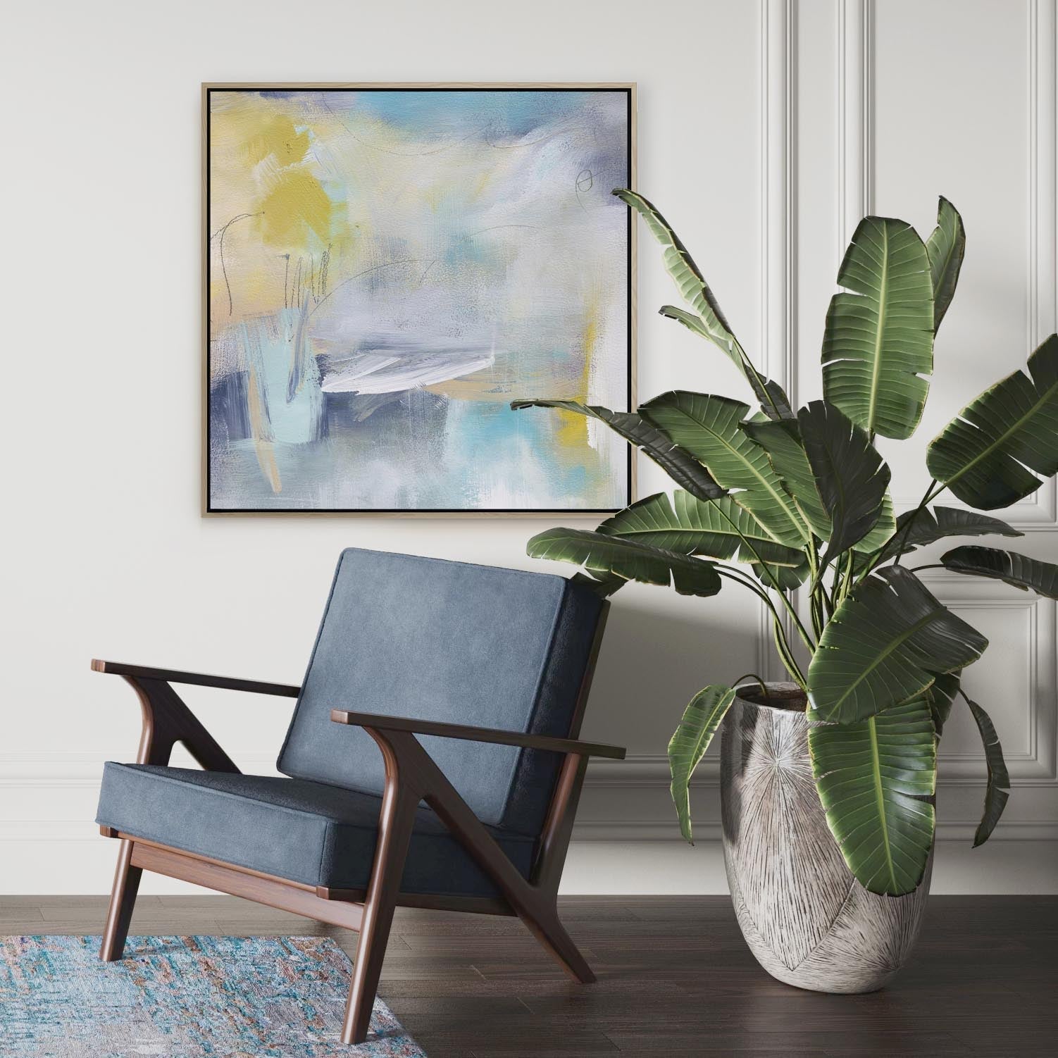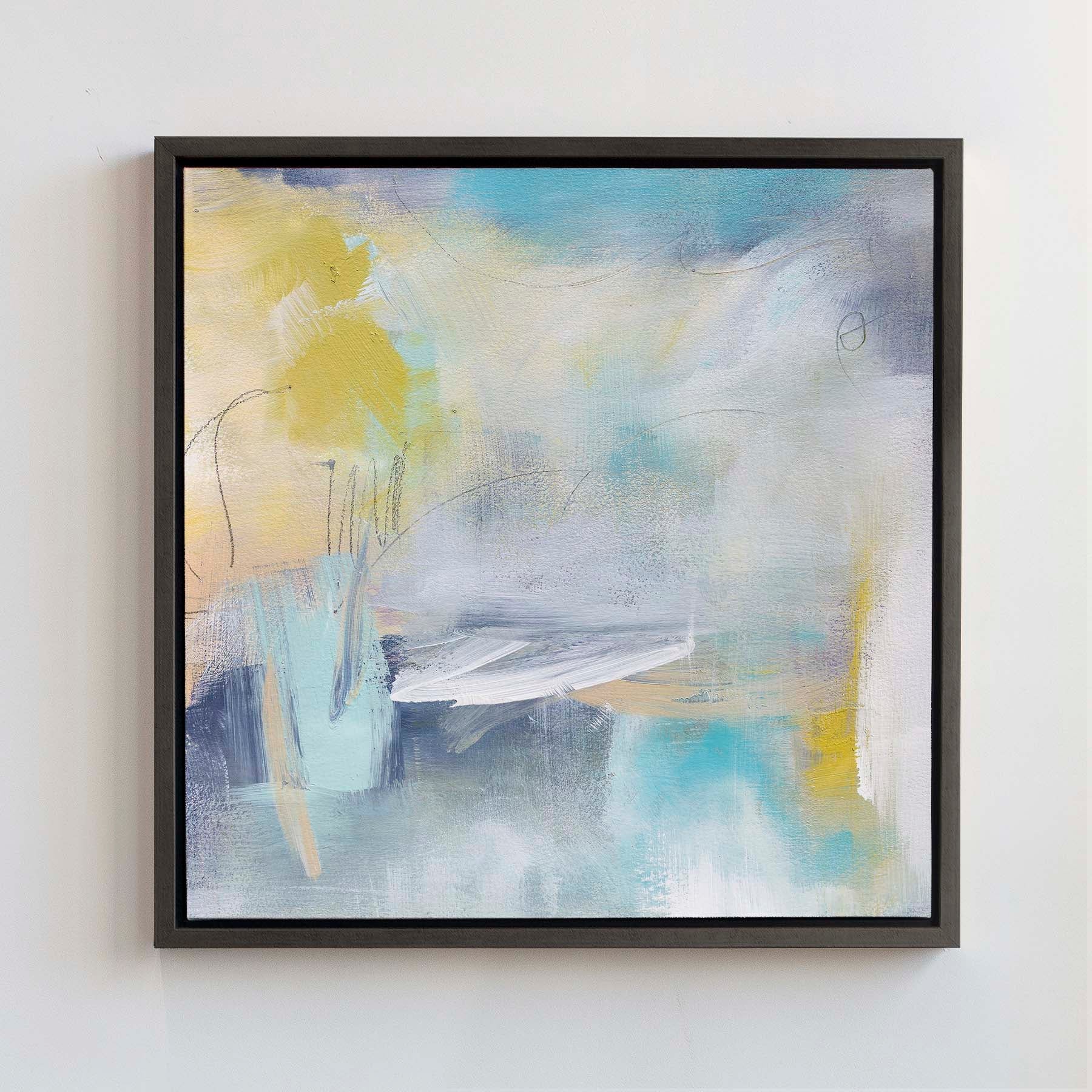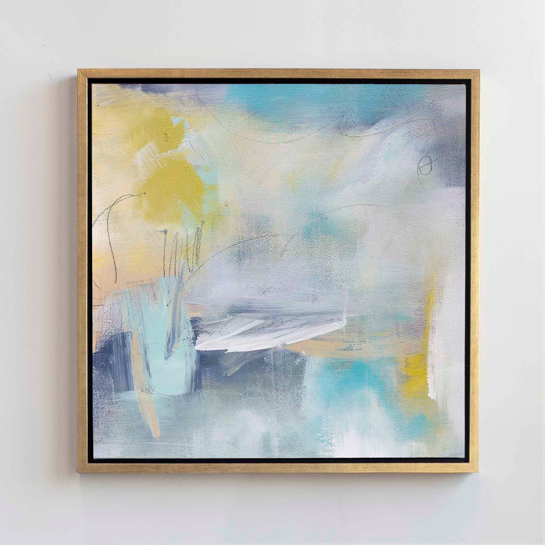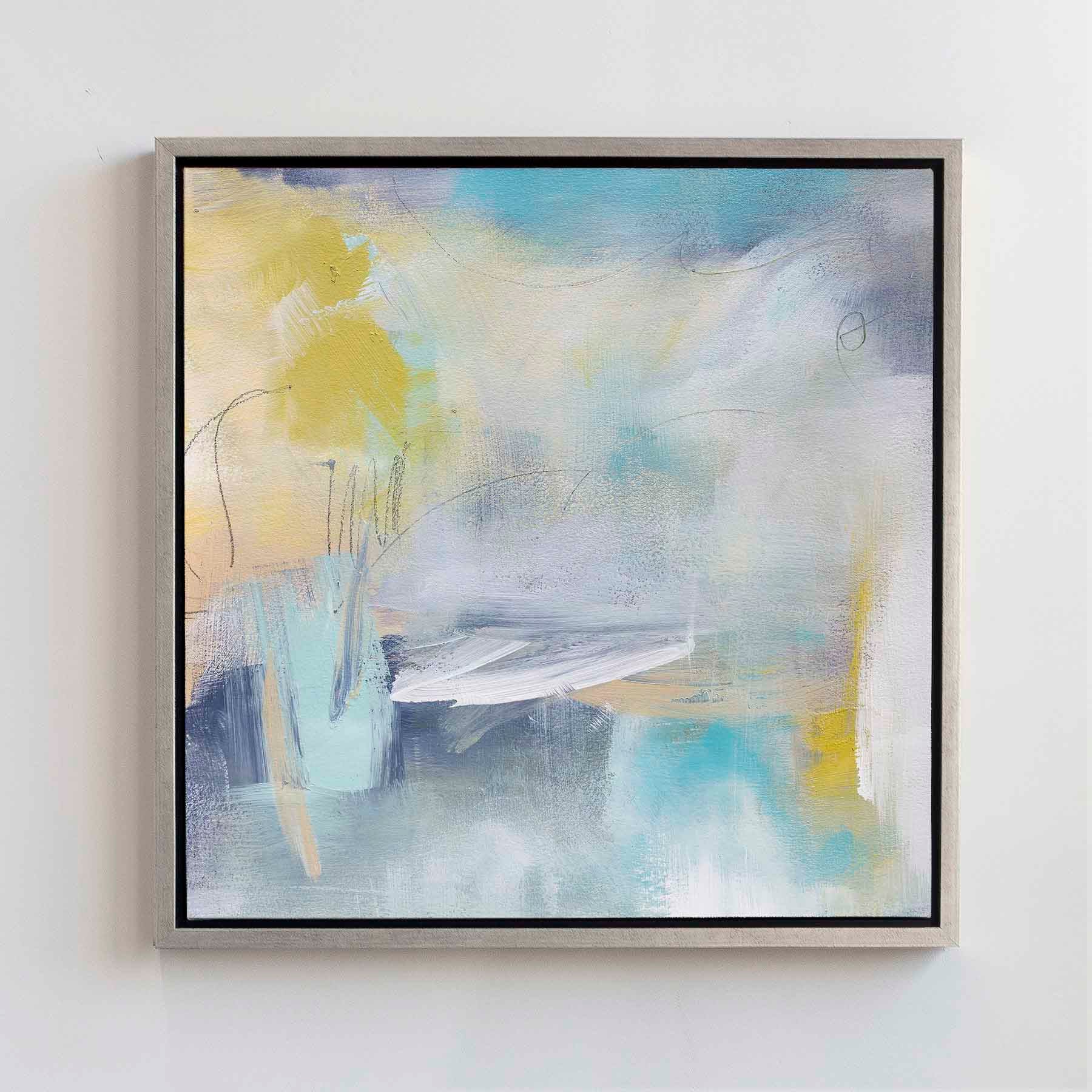 A playful abstract with shades of blue mingled with neutral tans and creams, accented with line work details.