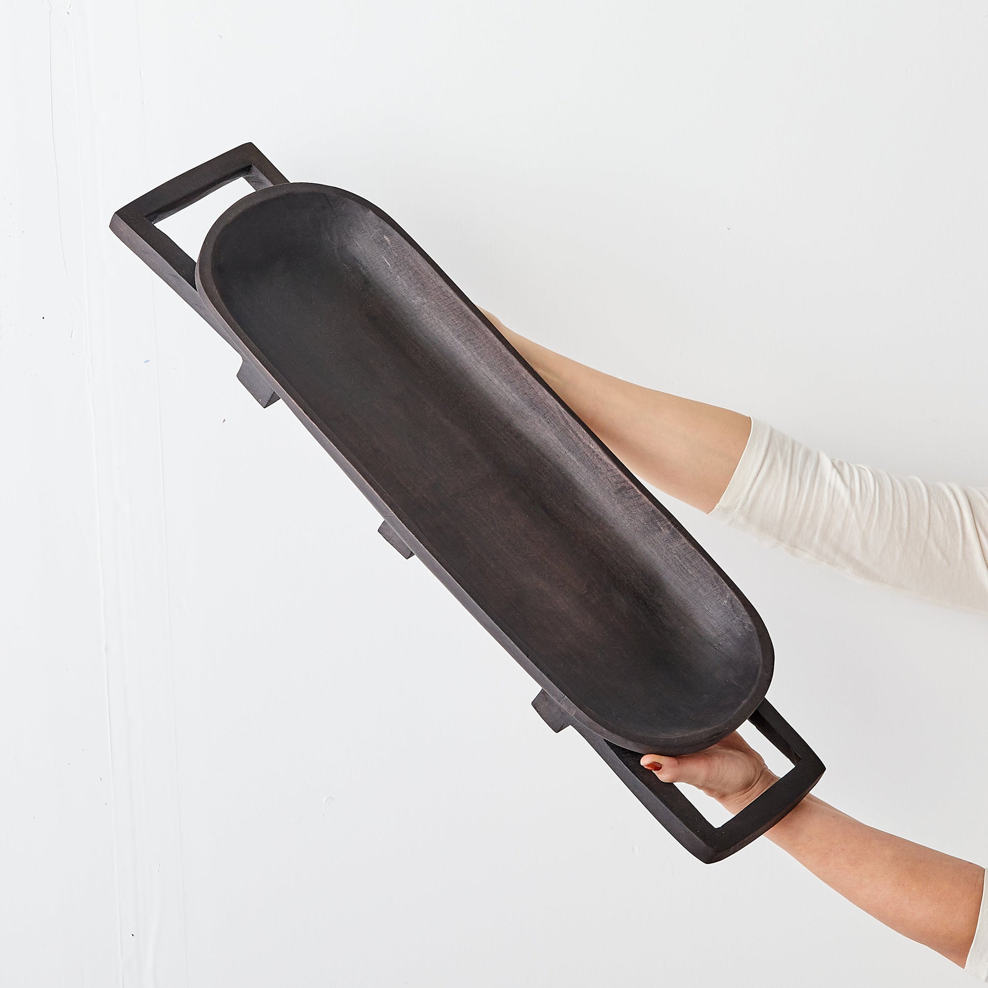 Hand carved in Eswatini from sustainably sourced Jacaranda wood, this tray features a raised design and a natural sheen. Crafted from a single piece of wood, including the legs and handles, it showcases the artistry and skill of the artisans. Choose between a raw, light wood finish or a dark stain for a personalized touch. Perfect for storage, display, or serving, this tray combines style and functionality in one beautiful piece.