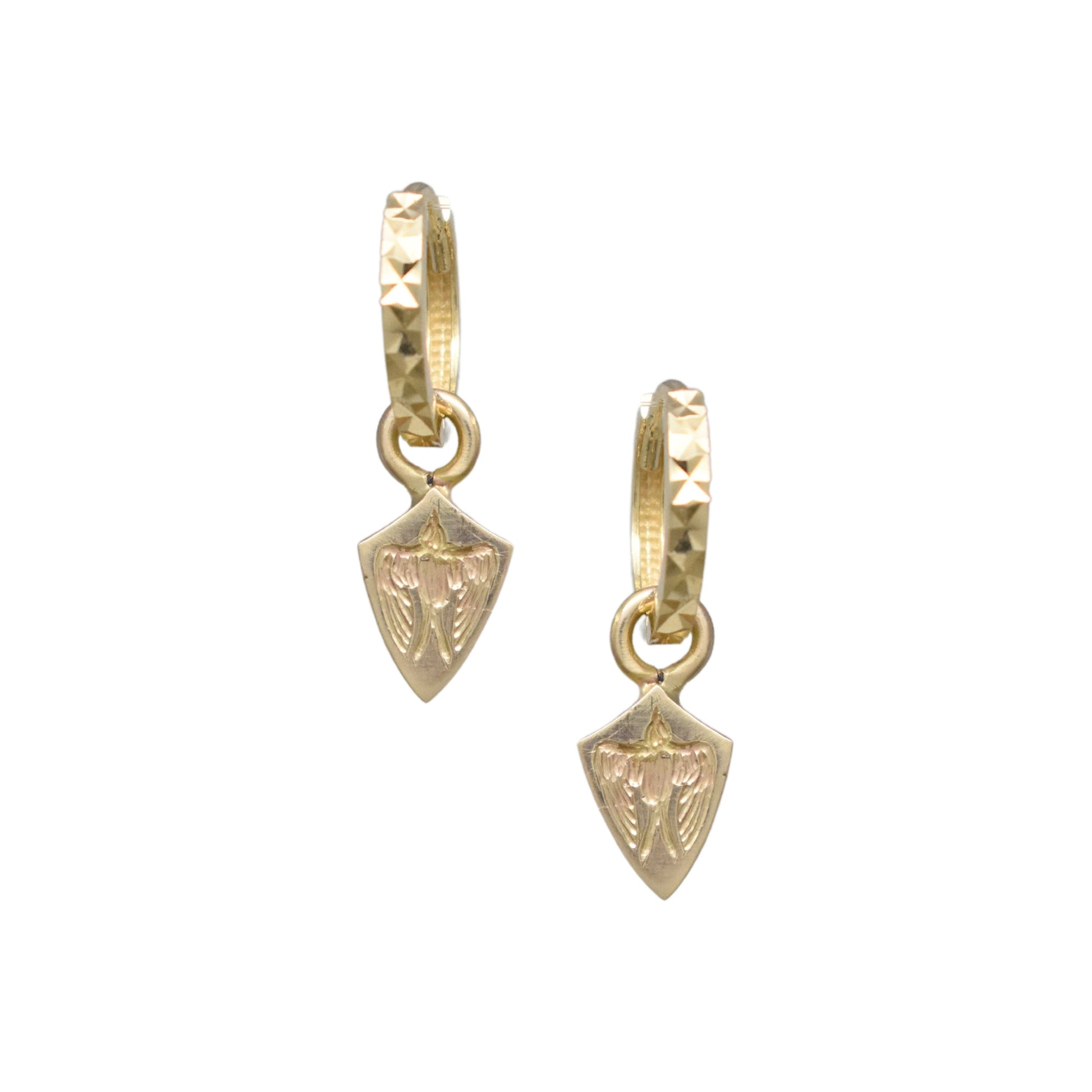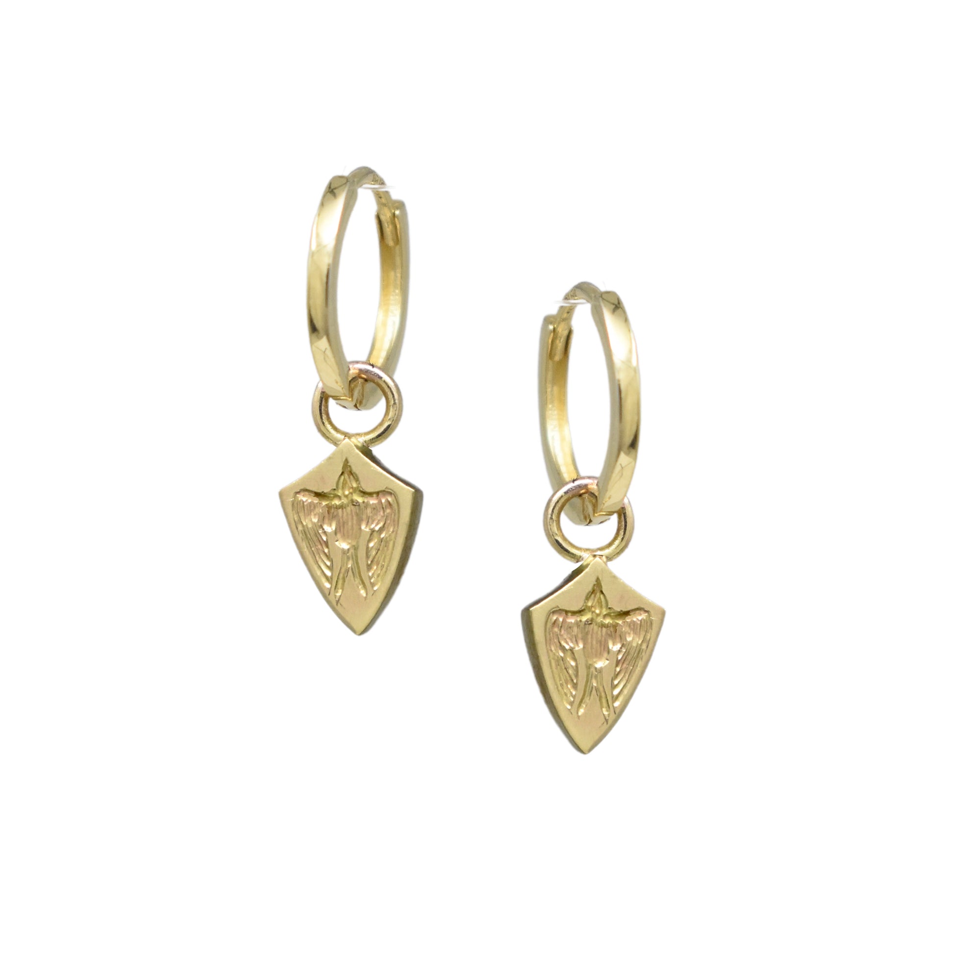 The sweetest mini escutcheon charm huggies featuring a hand-engraved intaglio swifts.