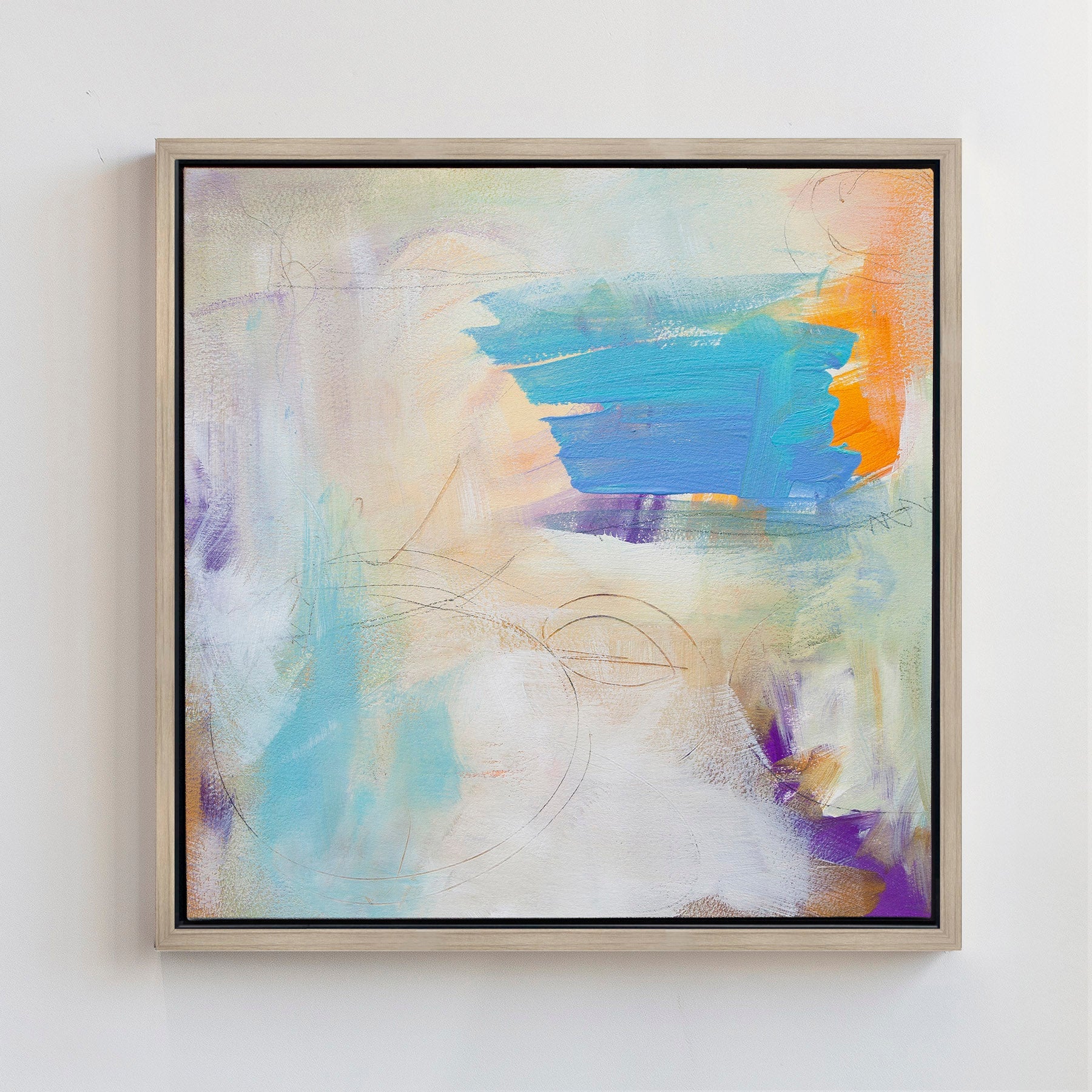 Created with acrylic and pencil, this soft palette spans from warm whites and cream to blue, purple and orange. A playful abstract that works well to delight any space.ld to add interest.
