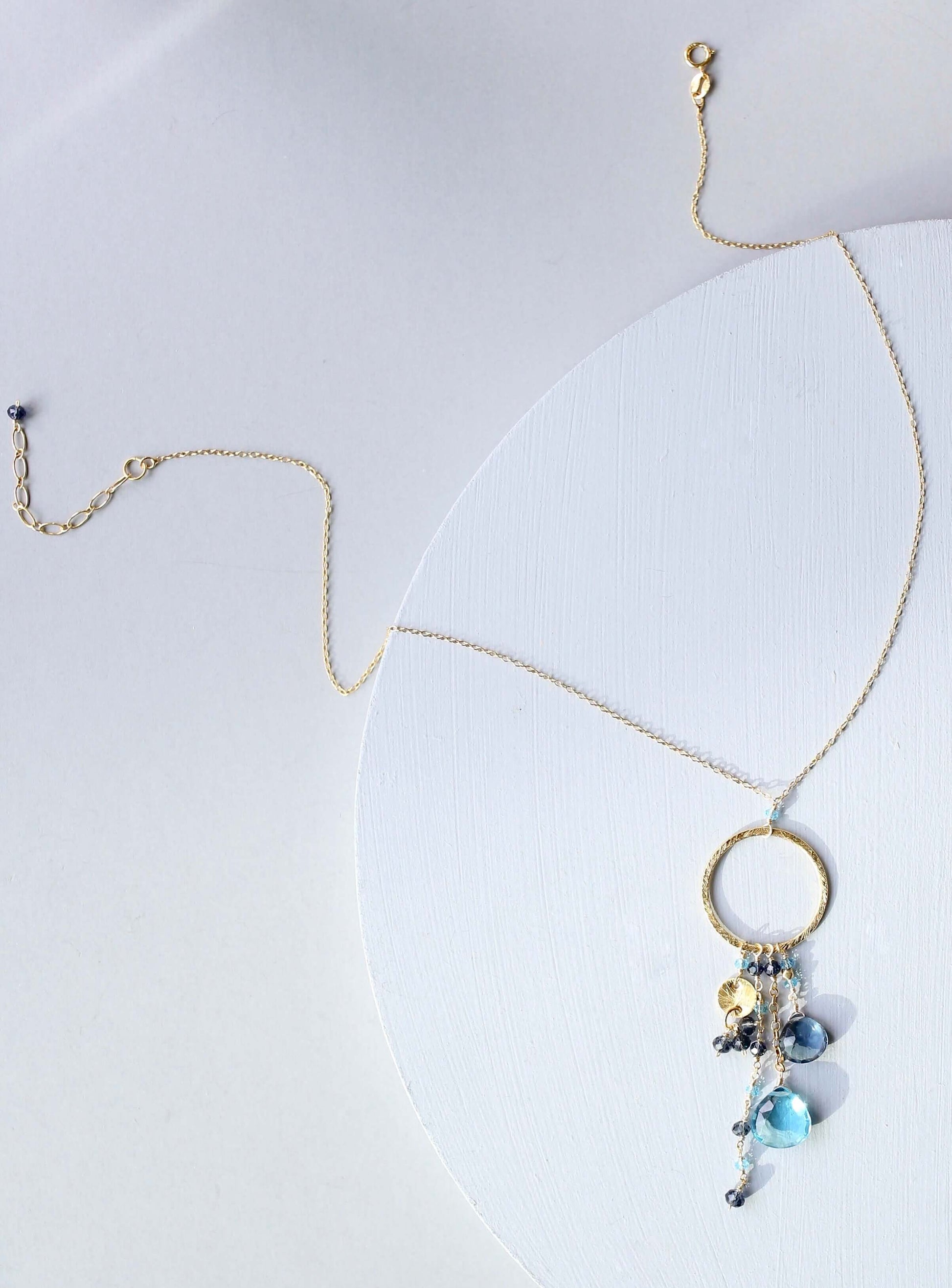 Lush aqua blue quartz and iolite gemstone necklace with multiple strands of different gemstone combinations streaming from a gold hoop.