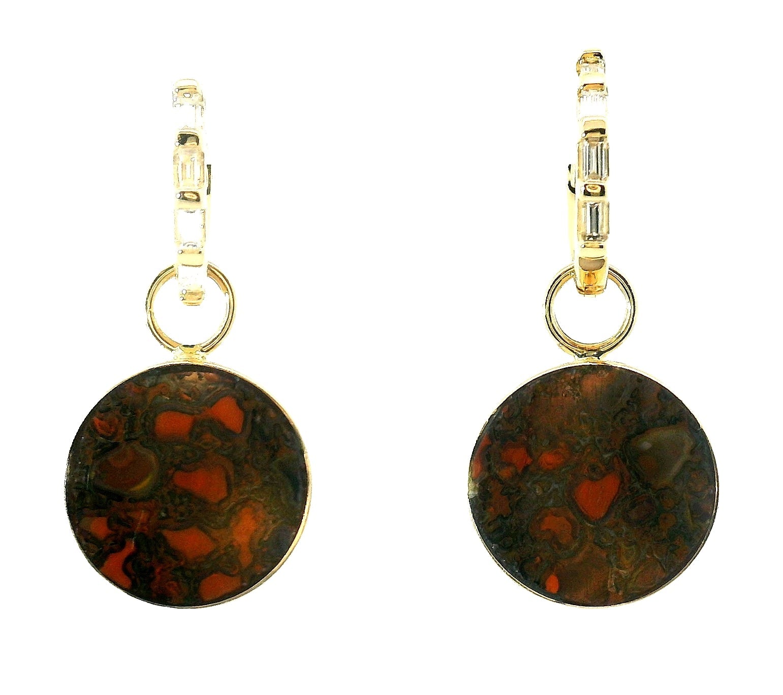 Perfect golden circles are inlaid with ancient and beautiful, red fossilized dinosaur bone. The charms are removable so you can wear the white diamond baguette hoops solo if you wish. The hoops are a "click in" style, so they are very secure and comfortable for everyday wear.
