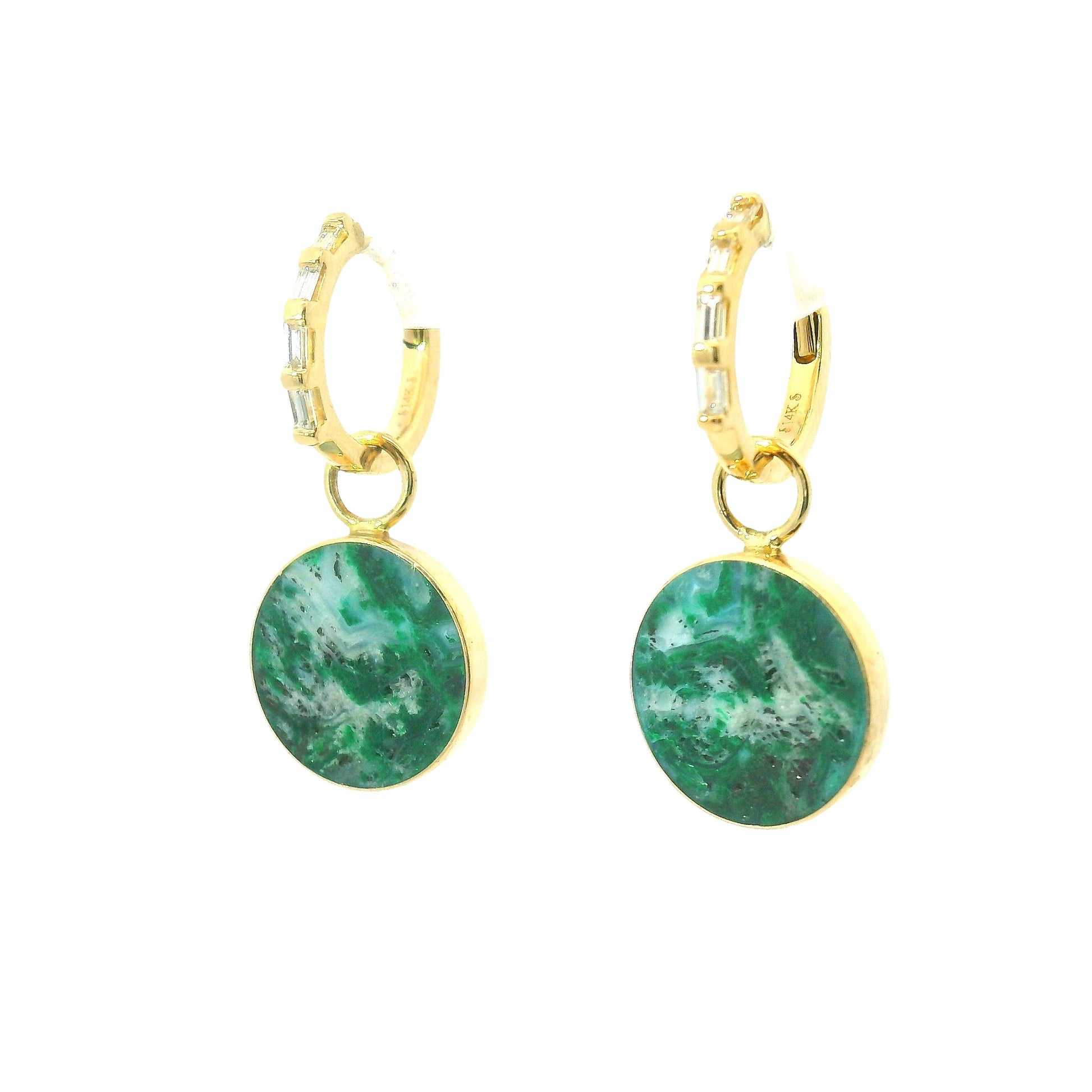 Perfect golden circles are inlaid with rich green, malachite in quartz. The charms are removable so you can wear the white diamond baguette hoops solo if you wish. The hoops are a "click in" style, so they are very secure and comfortable for everyday wear.