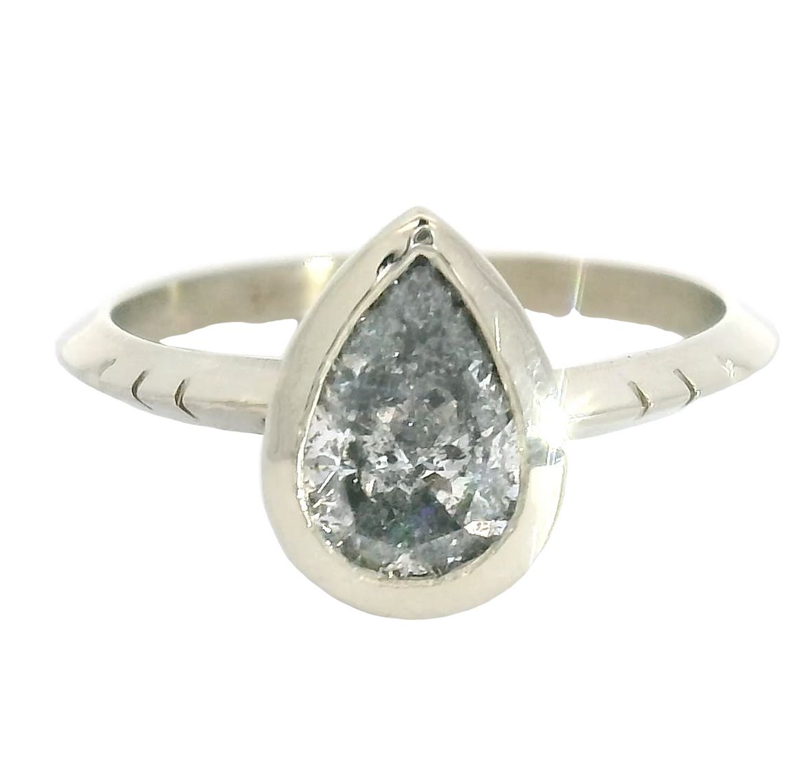 This ring is a size 7. It can be resized up or down within 3 sizes. This solitaire features a deep and dark galaxy diamond set with a secure and modern bezel setting. This stone is highlighted by our signature carved Helena band.