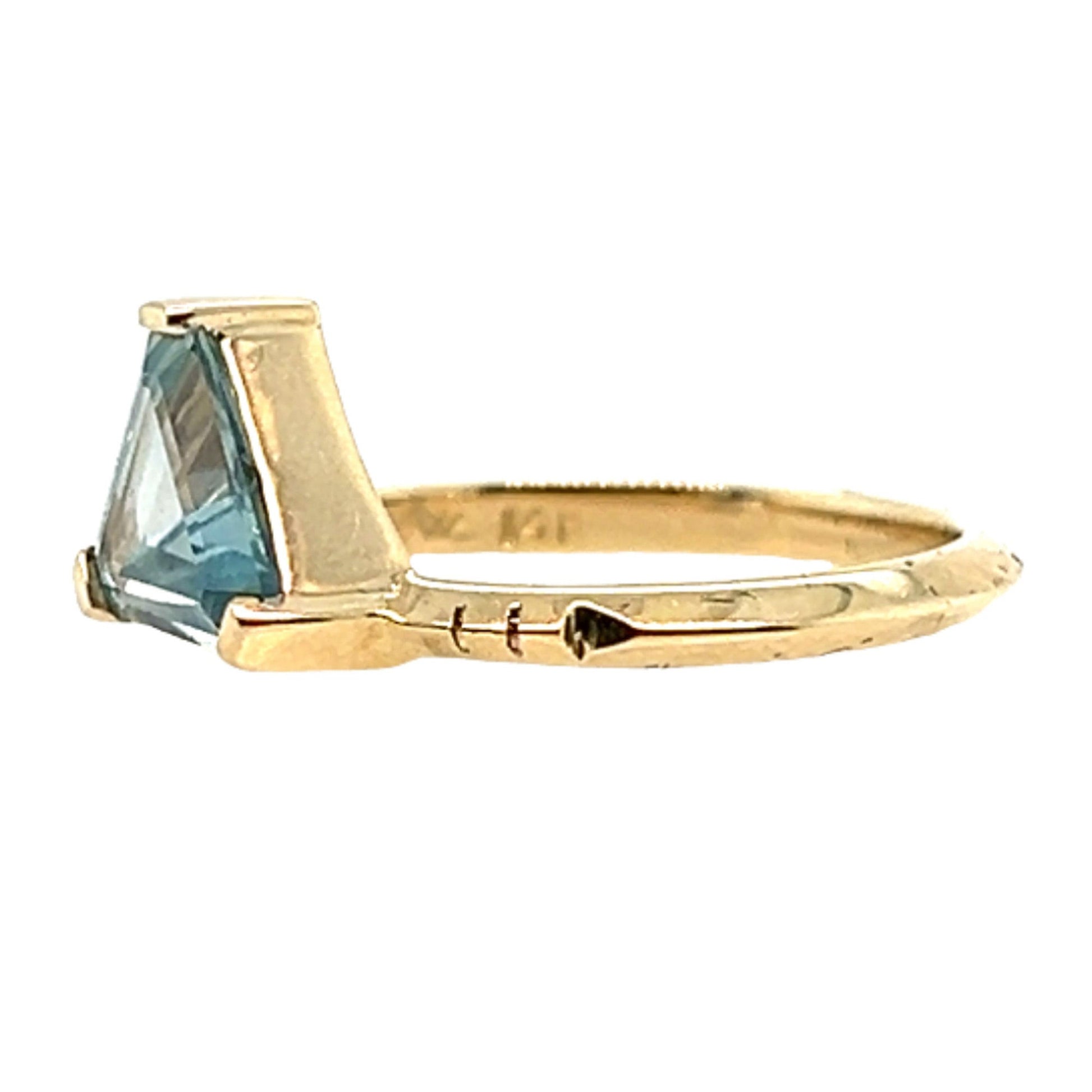 This stunning ice blue Montana sapphire is set with modern bar style prongs at each blunt corner of this triangular look sapphire. The hand carved, " Helena," style ring band adds to the graphic and strong modern vibe of this one of a kind ring.