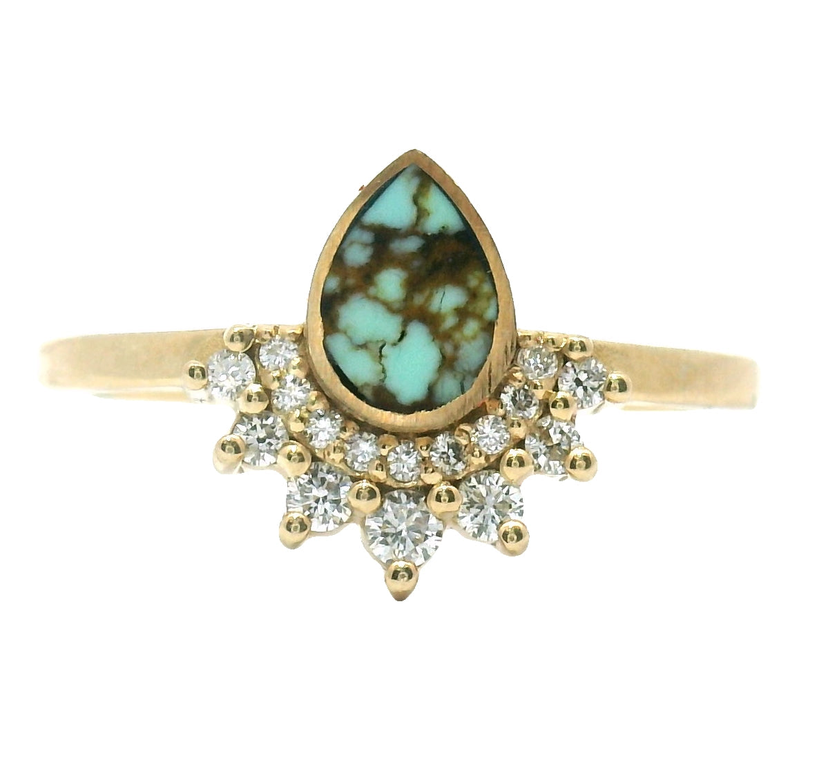 This beautiful ring features American-mined No. 8 Turquoise that is hand-cut into the shape of a droplet and wrapped in warm 14k yellow gold. A brilliant diamond halo contours the curve of the stone making this piece a true artistic statement.