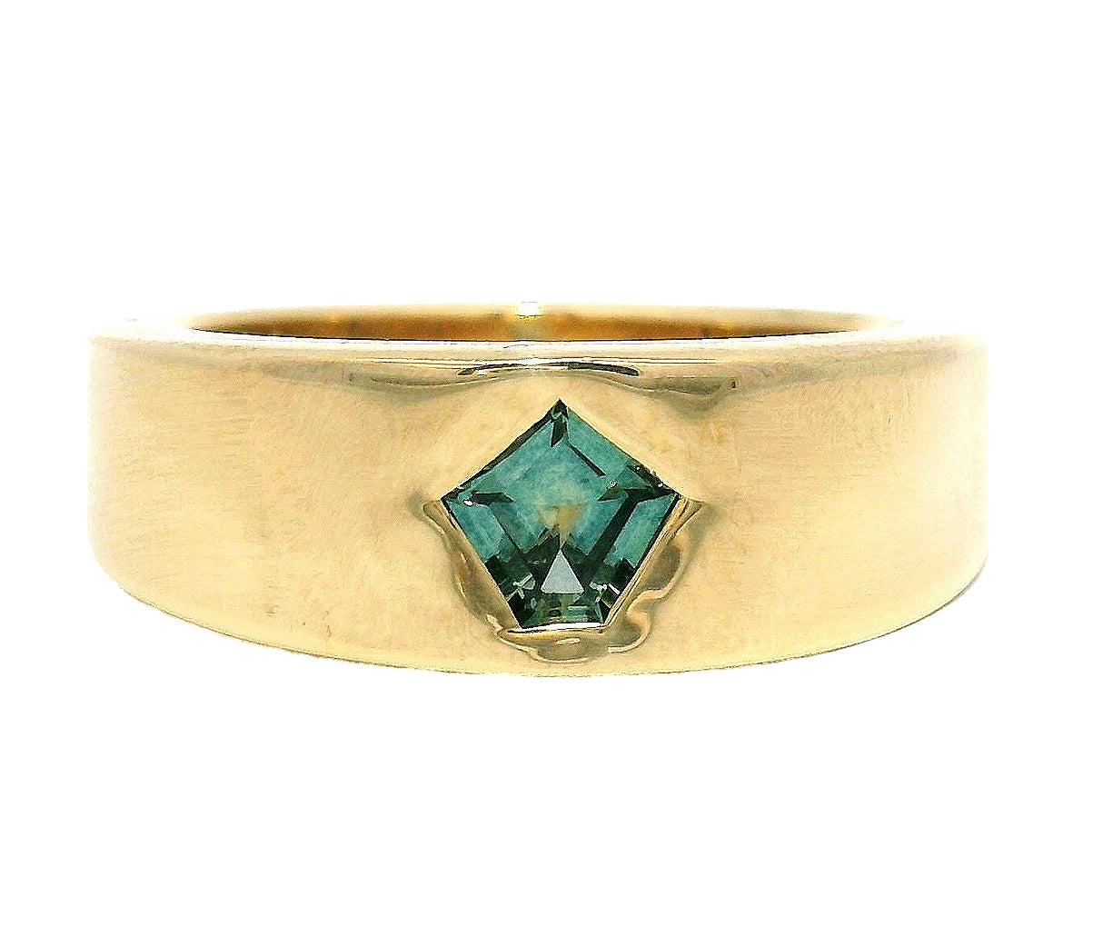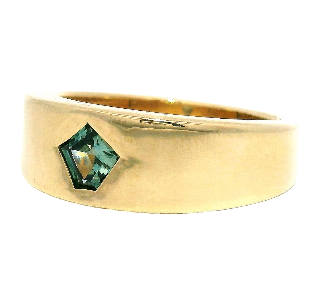 A teal and blue, kite cut Montana sapphire is flush set in a wide golden band. This ring tapers at the back for a comfortable fit and has a great weight. The special nature of this sapphire hidden in the gold glow of the ring, makes for a wedding band worth of your love. If your the style of person to value beauty and unique style, this one of a kind ring is for you.
