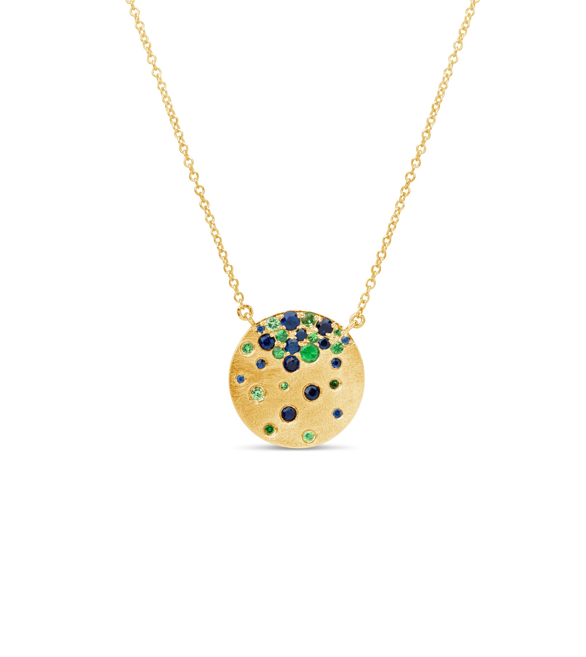 Sparkle like the night sky with our Tsavorite & Sapphire Celestial Disc Necklace! Made with 14k green gold brushed finish, the 18" chain is adjustable to 17" and 16" for a perfect fit. Adorned with scattered tsavorite and sapphire, this pendant will add a touch of celestial beauty to any outfit. Own the stars today!