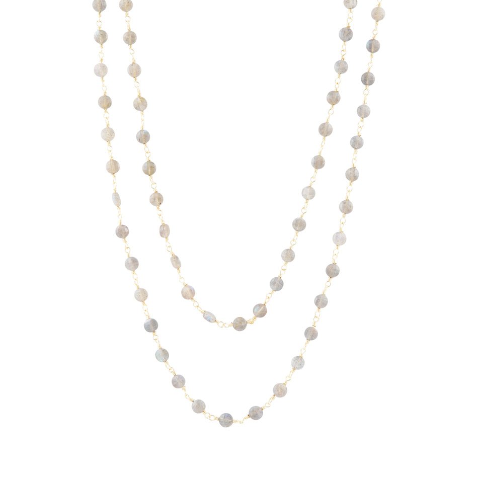 Add some colorful flair to your wardrobe with our genuine gold plated brass and Labradorite necklace! Two rows of rosary linked faceted labradorite creates a unique piece that is sure to make a statement while only weighing 25.6 grams. Inner layer is 35" and outer layer is 37". With a 2" extender chain and lobster claw closure, it can be easily adjusted for the perfect fit.🌟